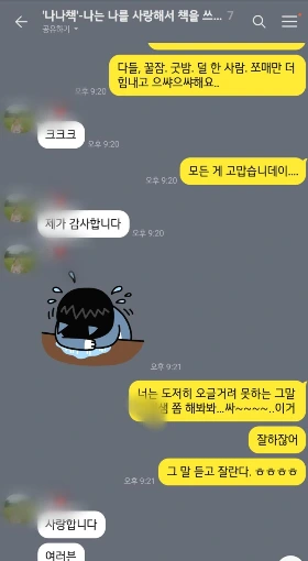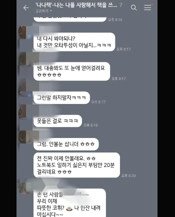 이런 작가들의 상황을 실시간 핸들링하기 위해 내 전화기에 불이나지 않은 게 다행이다. 그나마 일이 덜 번거로운 이유는 편집담당자분에게 작가마다 직접 파일을 보내면서였다. 중간에 그것을 모으고 하나의 파일로 작성하고 보내고 다시 보내는 일까지 했더라면 나는 일주일 이상 운영하는 공방 문을 닫아야 했을지도 모른다. 공저에서 단톡이라는 시스템이 없다면 지금의 몇 배나 복잡하고 지연되어 서로 낯을 붉히겠다고 생각했다. 척하면 딱하고 바로바로 업무처리가 되지 않았지만 서로를 기다려주는 배려와 유머로 부대끼는 속마음을 토로하고 다독이기도 했다. 이런 훈훈함은 단톡이 있어 가능하지 않았을까? 단톡이 우리 작가들의 한마음을 지켜준 것이다.