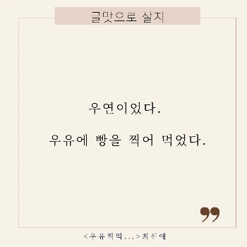 사람은 일상의 어떤 상황, 어떤 순간에 번뜩임을 느낀다. 그것은 감정이기도 하고 시선의 멈춤이기도 하다. 이상하거나 울컥하거나 짠한, 그런 평이하지 않은 찌름. 그 '순간'은 붙들어 쓴다면 생각을 담는 한 편의 글이 되고, 놓치면 아무것도 아닌 조각이 된다. 산문을 쓸 때, 운문을 쓸 때 이런 찰나는 무척 소중하다. 빵을 우유에 찍는 하찮지만 비 일상적 찔림에서 일전부터 허덕이는 일련의 감정을 파헤칠 수도 있고, 스스로 용기를 가지라 다짐을 찾아내기도 한다. 오래 지속된 지루함과 나태함이 일침을 맞기도 한다.