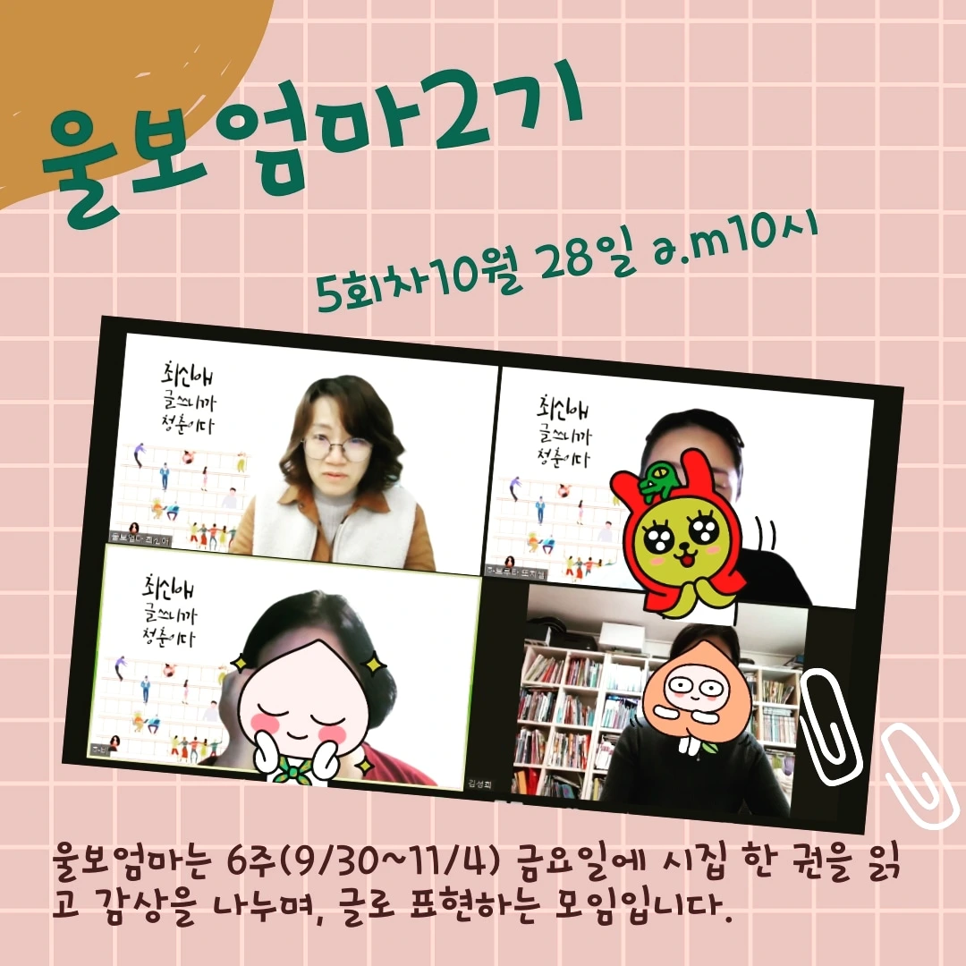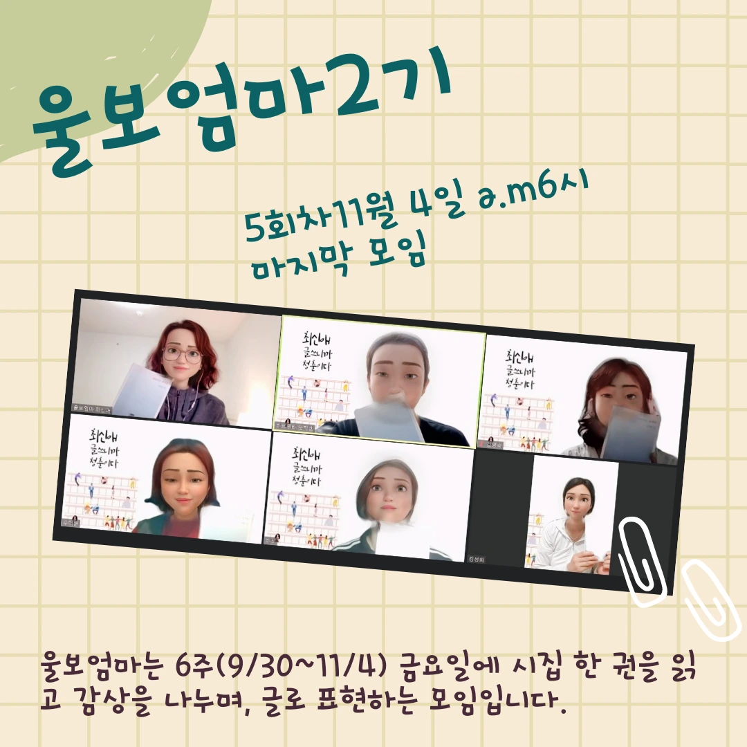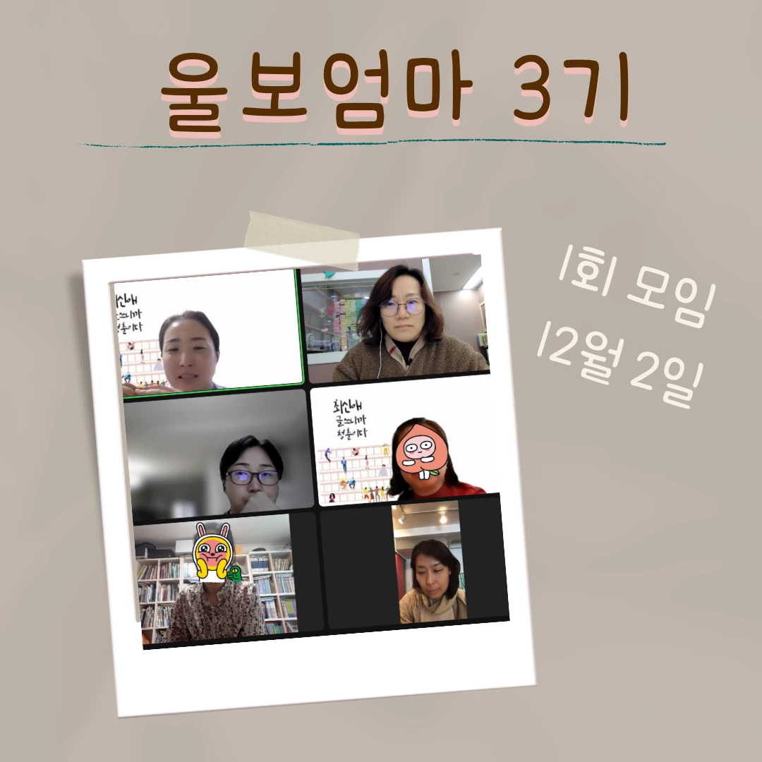 내가 가장 잘 선택한 것을 순위를 매길 수 없지만, [울보엄마]라는 모임을 만들어 시작한 것이다. 처음에는 자기 계발이나 성장을 향한 목표를 세우고 달려가는 엄마들이라도 때론 자신의 한계에 울컥하거나 막힌 벽 앞에 멈칫할 수 있으니 울음을 참지 말고 함께 마음을 나누는 클럽을 만들려는 단순한 마음이었다.