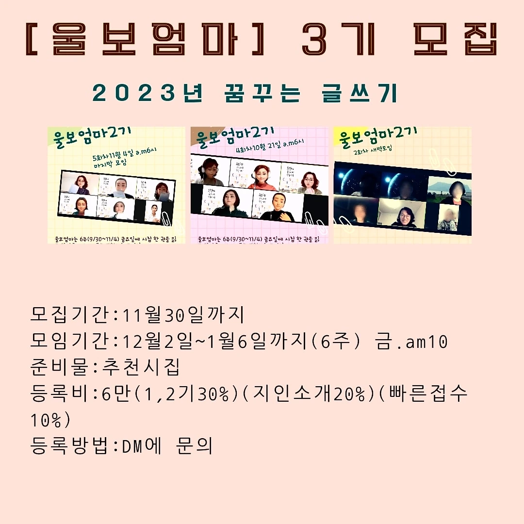 멤버들이 [울보엄마]를 잘 만났다는 말을 뒤집어본다. [울보엄마]를 잘 시작했고, 참여해준 이들이 있어 감사할 따름이다. 그들과 함께하는 시간이 무척 익숙한 습관 같다. 만약 일주일에 한 번 그 시간이 없고, 익숙하게 만나는 그들이 없었다면... 감히 상상을 할 수 없는 일이다.
