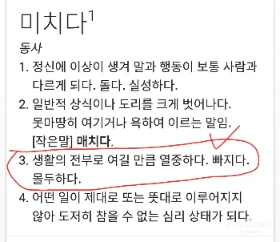 "아, 미*? 아까 엄마가 생각 없이 한 말 말이지? 그걸 듣고 그렇게 화를 내는 거야? 그건 힘들다는 말이잖아. 모든 미친, 미치겠~이런 말이 욕은 아니야. 남을 향해하면 완전 욕이지만 힘들어 미치겠다. 배고파 미치겠다라고도 쓰여. 사실 너무 심하게 힘들거나 그 정도가 심하면 쓰기도 하지."