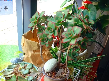 말라죽을 위기 다육이 몇을 지인으로부터 입양했습니다. 남의 손에 고사될 아이들이 제 손에 다시 소생할 수 있다 생각하니 얼마나 기쁜지요. 입양한 아이들은 거칠게 다룹니다. 너무 쳐다보면 목이 마를까 물을 부어주게 됩니다. 그러면 썩어 죽죠. 그래서 마음을 끊고 물을 주지 않으면서 볕과 바람에게 맡깁니다. 통풍이 제일 중요하다는 전문가의 말을 빌어 최대한 문에 가깝게 둡니다. 거칠수록 단단하게 자라는 다육이들. 이전 주인들의 사랑이 넘쳐 과습 상태였습니다. 지나친 관심과 사랑이 성장을 가로막을 수 있다는 사실을 다시 새깁니다. 아이들에게 지나친 관심과 배려가 다 좋지만 않거든요. 어쩔 때는 무관심과 맡겨둠을 선택해야 합니다. 다육이들이 다글다글 힘을 내고 있습니다.