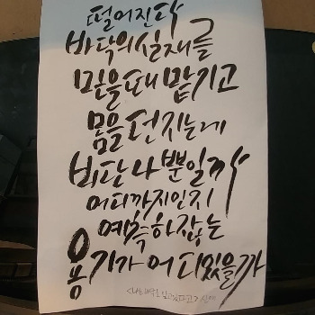 눈을 뗄 수 없었다. 와이퍼를 부러 작동하지 않았다. 물방울에 매달린 낙엽이 떨어질까 봐 저속으로 운전했다. 가려진 시야, 느린 속도로 가을의 한가운데로 들어갔다. 낙엽이 너무 일찍 찾아온 것 혼잣말하다 히죽 웃었다. 낙엽은 계속 침묵하더라.