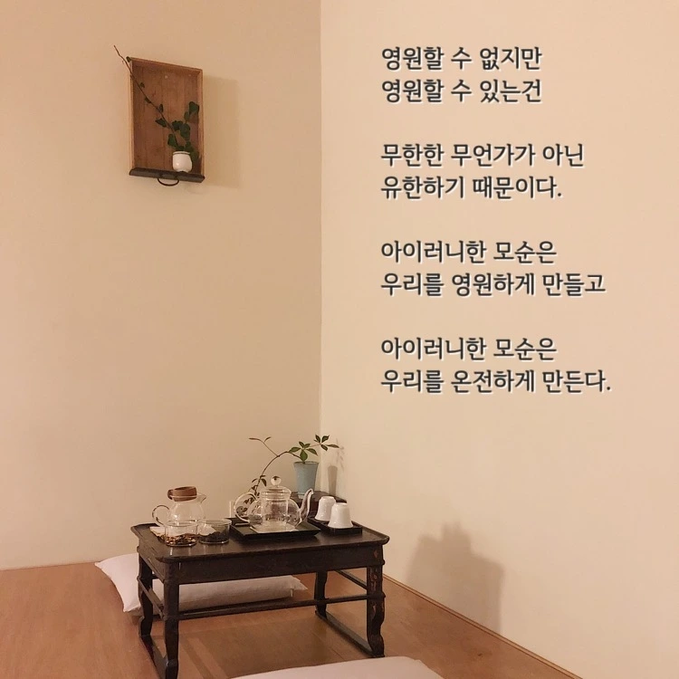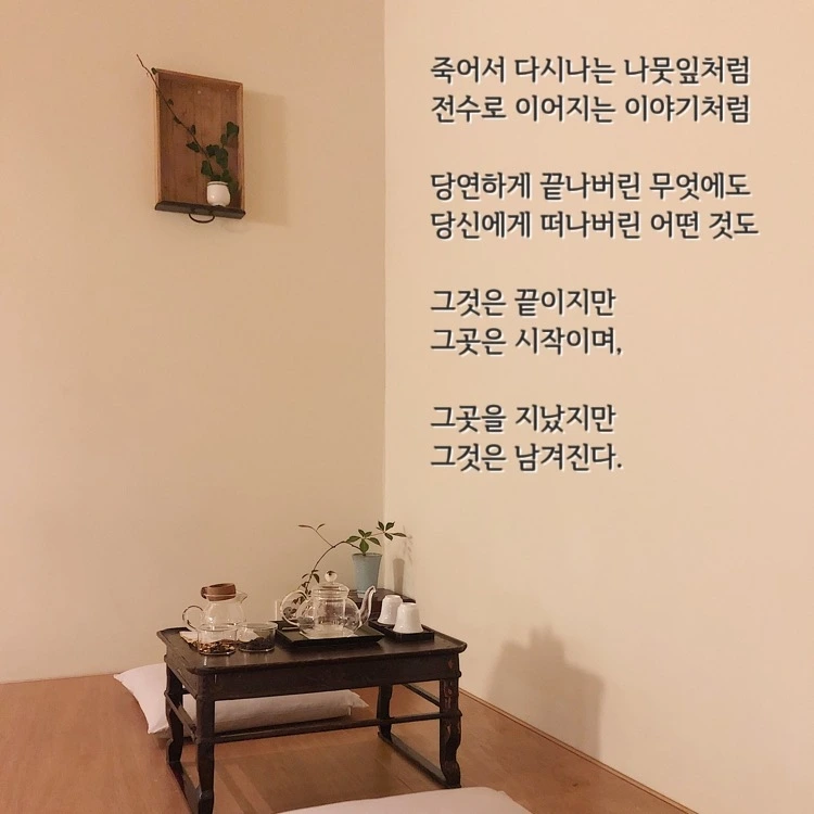 영원할 수 없지만영원할 수 있는 건무한한 무언가가 아닌유한하기 때문이다.아이러니한 모순은우리를 영원하게 만들고아이러니한 모순은우리를 온전하게 만든다.죽어서 다시나는 나뭇잎처럼전수로 이어지는 이야기처럼당연하게 끝나버린 무엇에도당신에게 떠나버린 어떤 것도그것은 끝이지만그곳은 시작이며,그곳을 지났지만그것은 남겨진다.