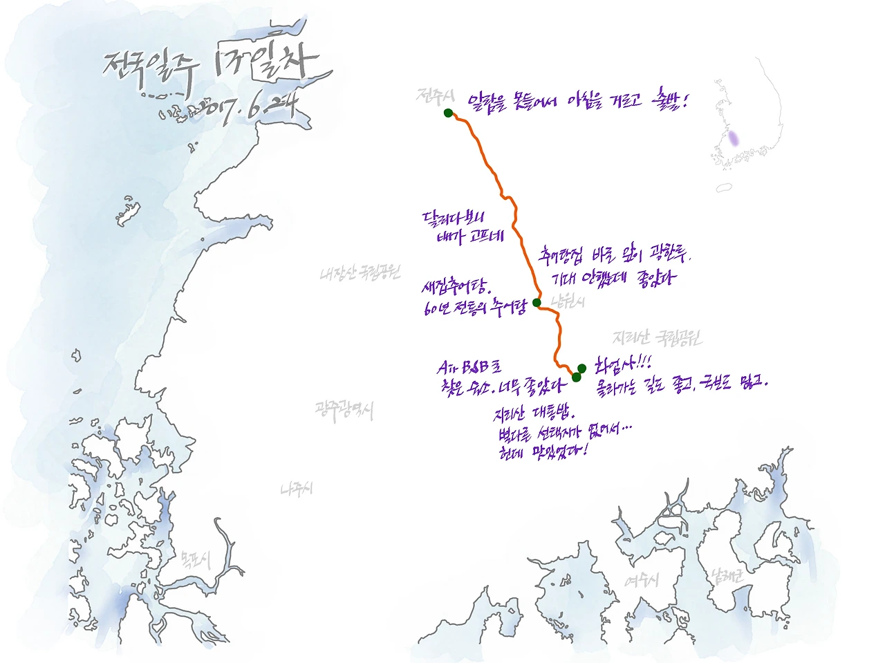 이제 전주를 출발해 남원을 거쳐 구례까지 내려왔군요. 앞으로 광주, 목포를 거쳐 제주도로 들어가는데, 제주에서 꽤 오래 지냈거든요. 제주에서 보냈던 시간은 어떻게 정리를 해야 할까 고민하고 있는데(하루하루의 이동 거리가 그리 길지 않기도 하고, 어떤 날은 집에만 있기도 하고...), 어쨌든 입도(入島) 전까지의 여정을 최대한 빠르게 포스팅해보겠습니다.