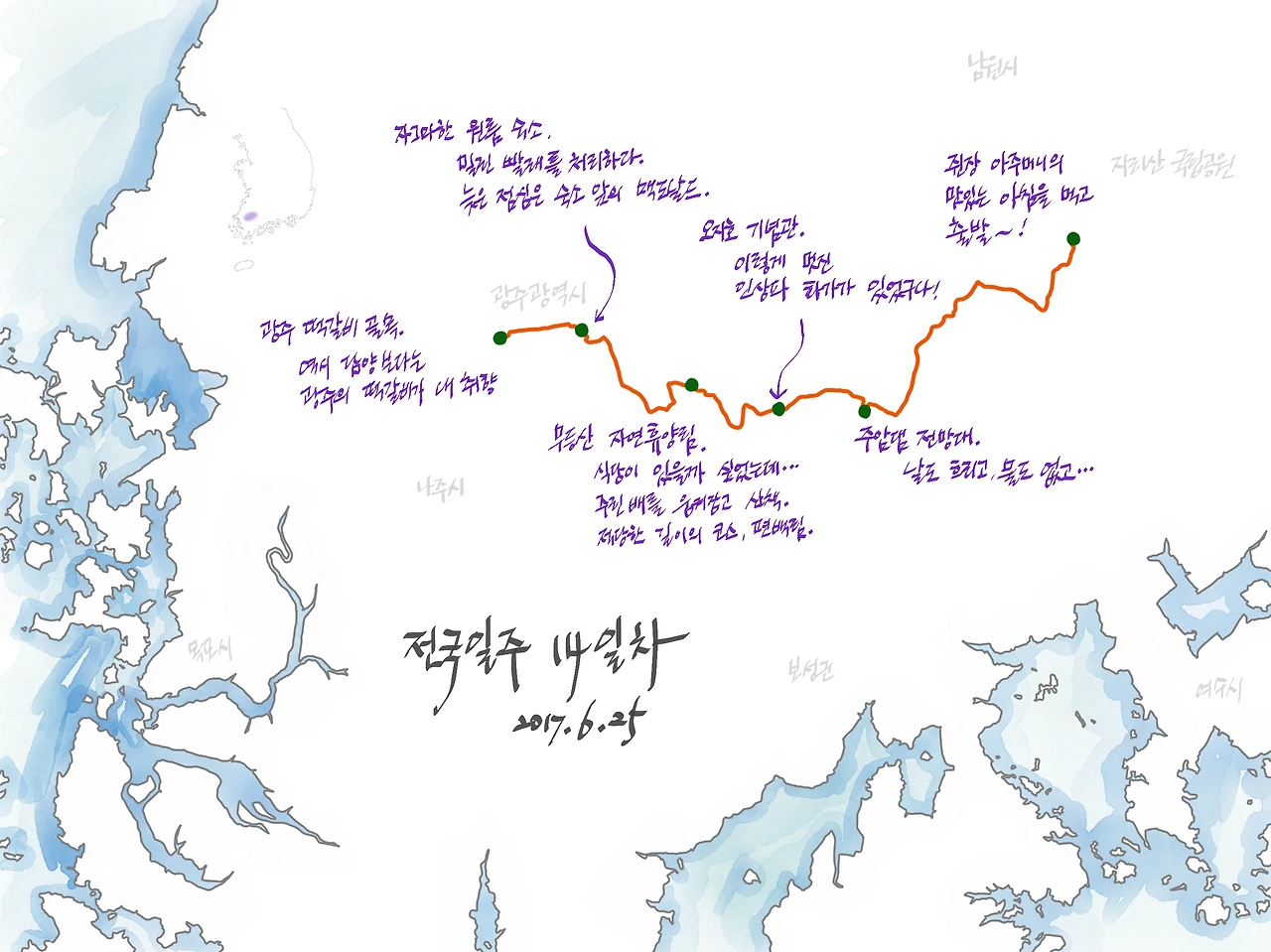 일단, 여행 과정은 모두 GPS 트래킹 해뒀고(Moves 앱으로 트래킹 했습니다. 이젠 서비스 종료했지만 ㅠㅜ), 데이터를 익스포트 해서 구글맵에 앉힙니다. 그런 다음 적절한 배율로 구글맵의 스샷을 찍고 그걸 구글 드라이브에 올립니다. 타야수이 스케치에서 불러들인 다음 레이어들을 이용해 윤곽선도 그리고, 여행 경로도 그립니다.
