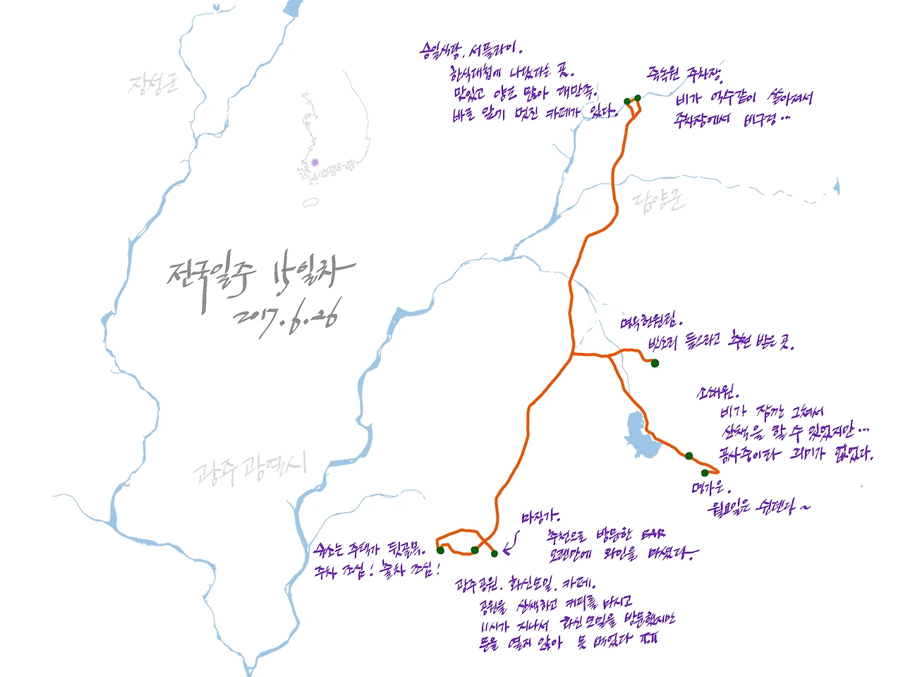 충격에 빠진 채 다시 지도 검색. 지금 당장은 비가 오지 않지만 조만간 다시 쏟아질 것 같은 날씨. 바로 근처에 광주호 생태공원이 있길래 비가 안 오는 동안 산책이라도 할까? 싶어 핸들을 그쪽으로 돌리는데, 페이스북에서 명옥헌원림(↗)이 좋을 거라는 추천을 받았다. 한 10km 정도니 금방 갈 수 있겠군!