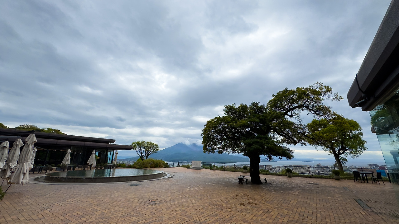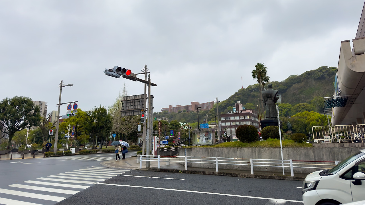 우산을 쓰고 걷다보니 지난 번에 가고시마에 왔을 때 산책하던 미술관 앞의 그 거리입니다. 그리고 멀리 시로야마(城山)의 등성이에 제가 묵고 있는 호텔이 보입니다. 멀리서 봐도 저렇게 크게 보이는 정도로 규모가 아주 큰 호텔이군요.