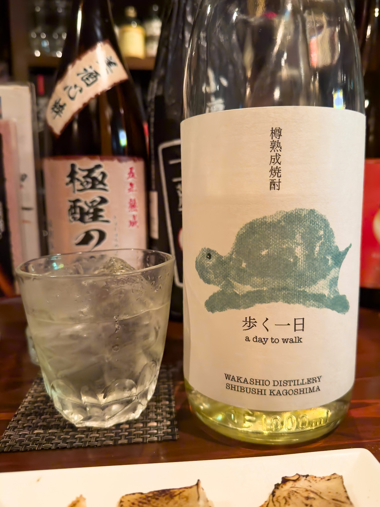 마지막으로 추천 받은 쇼츄. 歩く一日 a day to walk. 거북이 그림이 귀여운 쇼츄였는데, 맛이 좀 특이했습니다. 위스키 같은 느낌이 나는 쇼츄라고 하면서 추천해줬어요. 일품진로처럼 오크 향이 지배적일 거라고 상상했지만, 막상 마셔보니 그런 느낌은 아니더군요. 오크향은 아주 약하고 오히려 독특한 질감이 이 쇼츄의 특이한 점이었습니다.