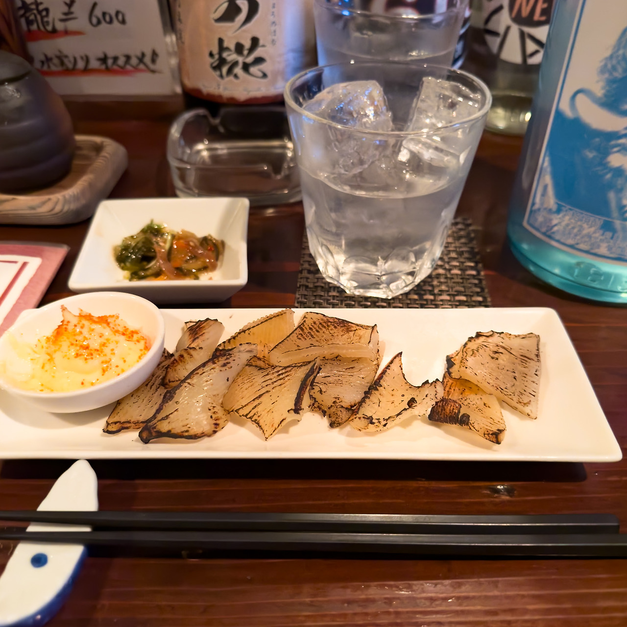 에이히레는 가오리 지느러미를 말린 것입니다. 일본의 술집에서 가장 저렴하고 흔하게 주문할 수 있는 마른 안주입니다. 우리나라의 쥐포랑 비슷한 위치라고 하면 될까요? 저녁을 배부르게 먹었으니, 가볍게 씹을 것을 주문하는 느낌으로 시켰어요.