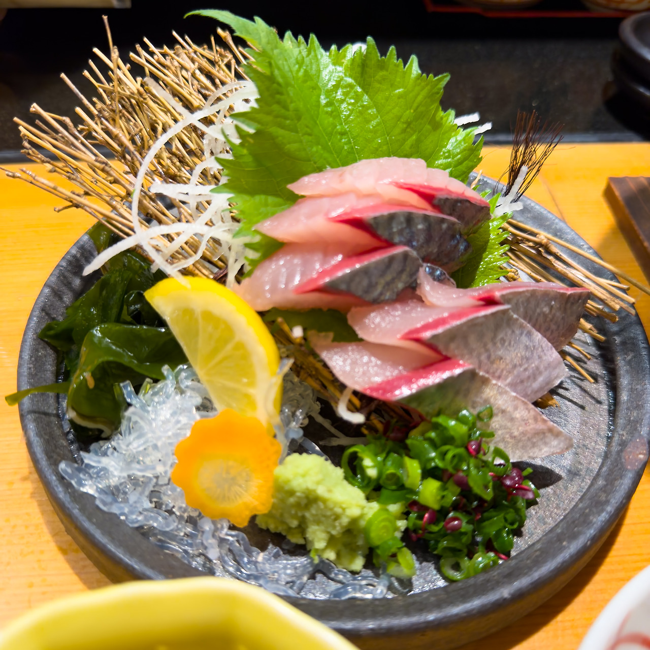 회도 한 점 먹고 싶어서 목 꺾은 고등어회(쿠비오레 사바, 首折れサバ)도 한 접시 주문했습니다. 가고시마쪽의 특산물이라고 알고 있는데요. 미스터 초밥왕에서 알게된 것입니다. 특이하게 고등어를 잡자마자 목을 꺾어 배에 매달고 다니면서 피를 빼는 방식을 쓰기 때문에 비린내가 없고 육질이 탄탄하다고 하던데요, 일단 고등어회를 저렇게 두텁게 썰었다는 점이 신기했습니다. 한 점 먹어보니, 우와 흰살 생선이라고 착각할만큼 깔끔한 맛. 참 맛있더군요.