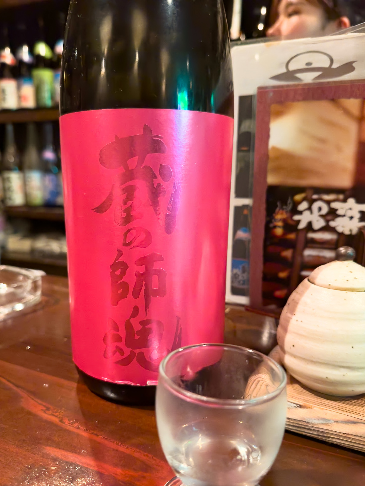 같이 얘기하면서 마시고 있자니, 알바생으로 보이는 젊은 아가씨가 재밌는 쇼츄가 있다면서 한 모금 마셔보라고 서비스를 줍니다. 쿠라노시콘(蔵の師魂) The Pink 라는 쇼츄인데, 재밌게도 와인의 향이 난다고 합니다. 솔직히 말하면 진짜 와인 같은 향이 나는 것은 아니고 잔향으로 살짝 포도의 뉘앙스가 느껴지기는 합니다. 아마 설명을 듣지 못했다면 느끼지 못했을 것 같은 미세한 향.