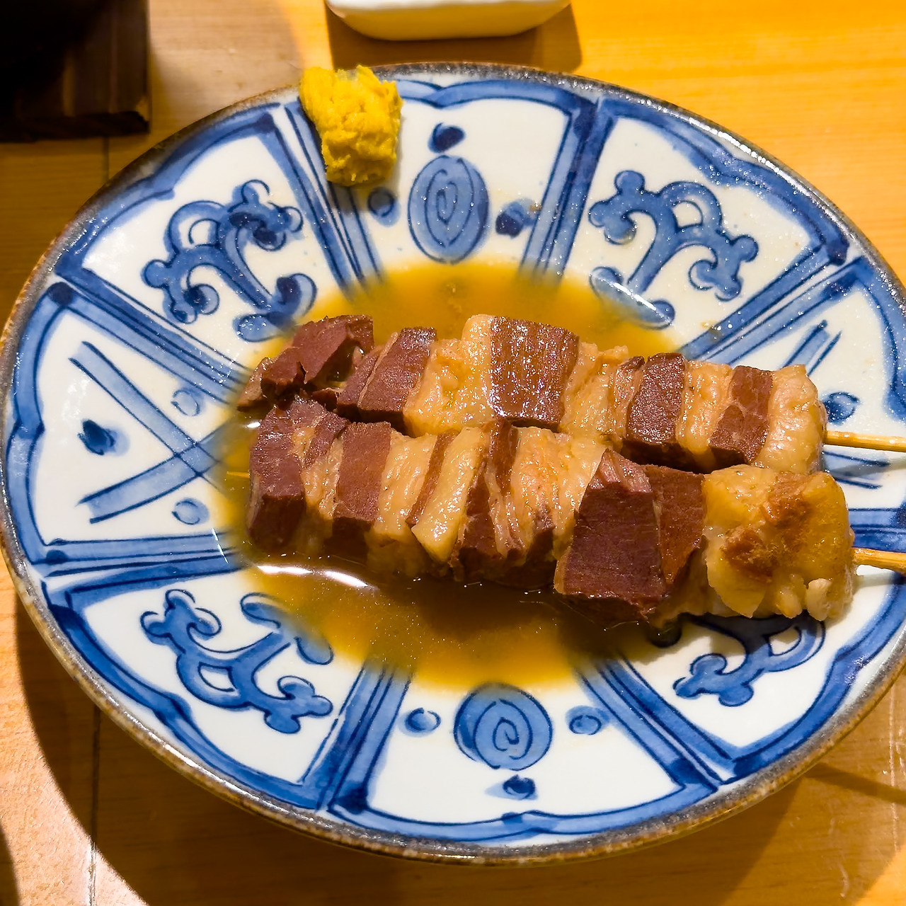 거기에 지난 번에 맛있게 먹었던 흑돼지 오뎅의 기억을 되살려 볼까? 싶어 흑돼지 꼬치 오뎅을 2개 주문했습니다. 아, 일본의 '오뎅'은 우리처럼 어묵만을 말하는 게 아니라 오뎅 육수에 넣어 익혀 먹는 거 전부 다 '오뎅'이라고 합니다. 그래서 무나 달걀이 어묵이 아니지만 오뎅 메뉴에 있는 거죠. 흑돼지 고기를 꼬치에 꽂아서 오뎅 육수에 넣고 익히면 바로 흑돼지 오뎅입니다.
