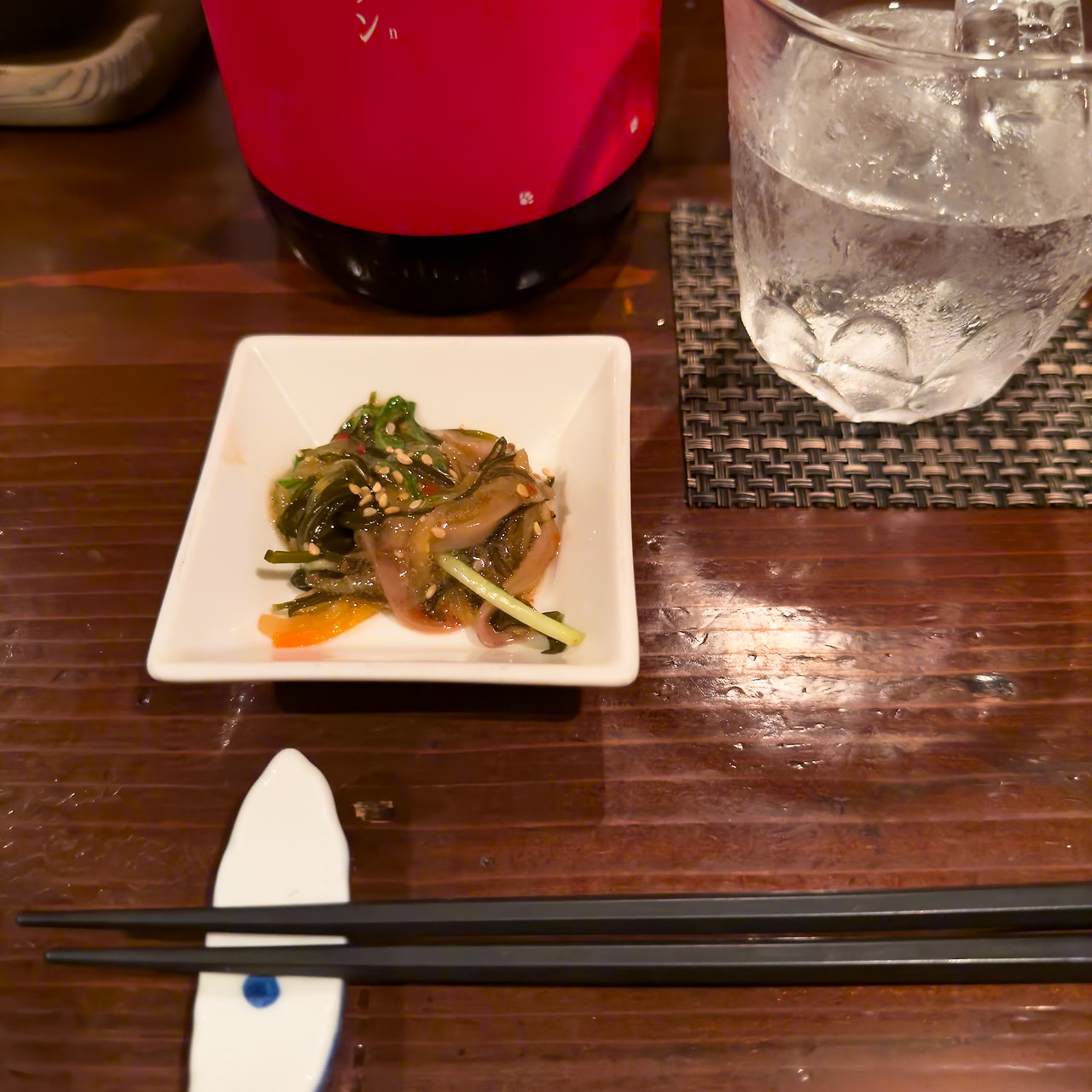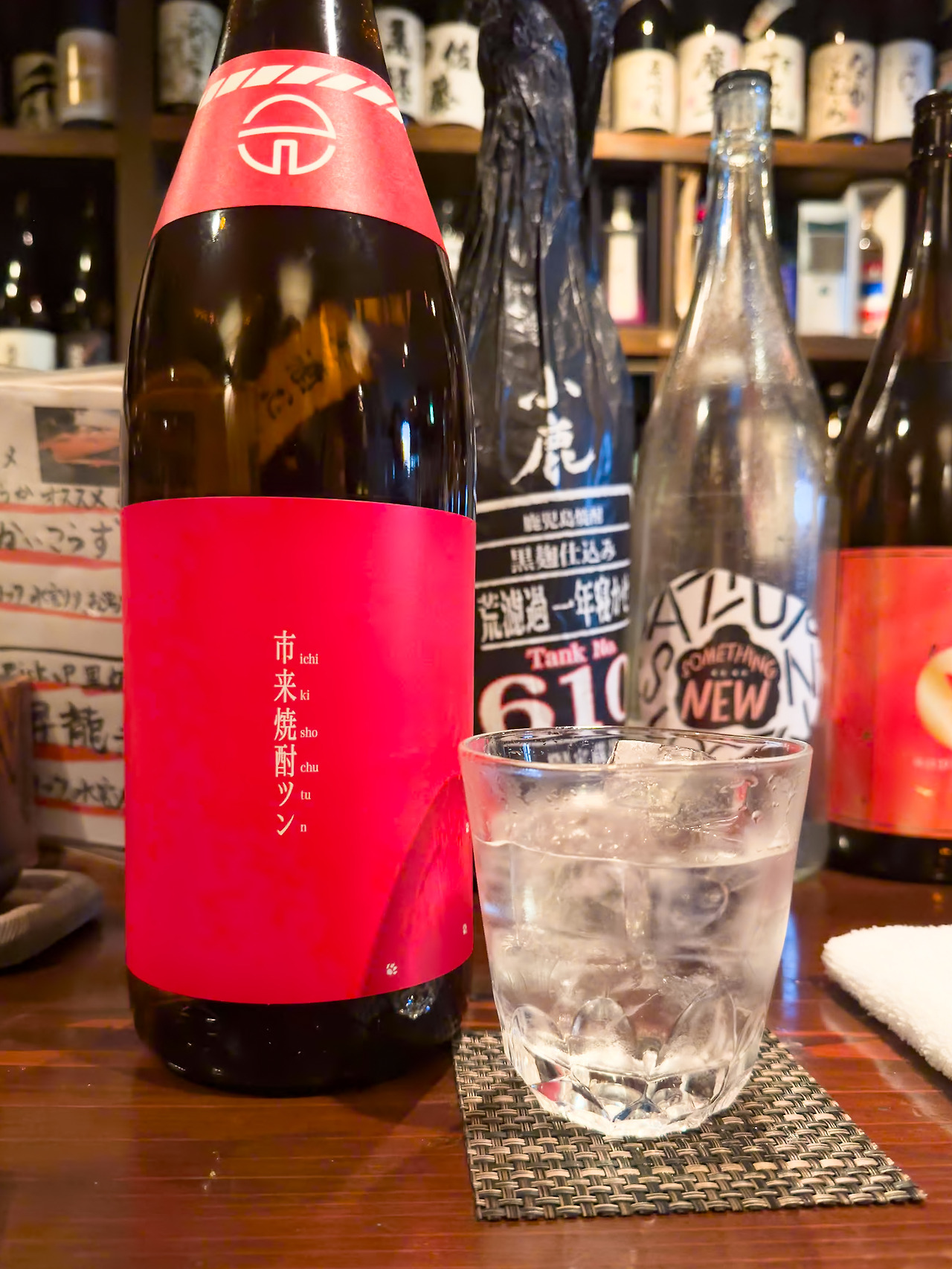 다음 잔은 로꾸로 추천을 부탁드렸습니다. 그랬더니 새빨간 레이블의 쇼츄를 한 병 들고 오시더군요. 사진에 찍히지 않은 뒷면에 작은 고양이가 그려져 있습니다. 레이블 뒤퉁이에 고양이 발자국 보이시죠?