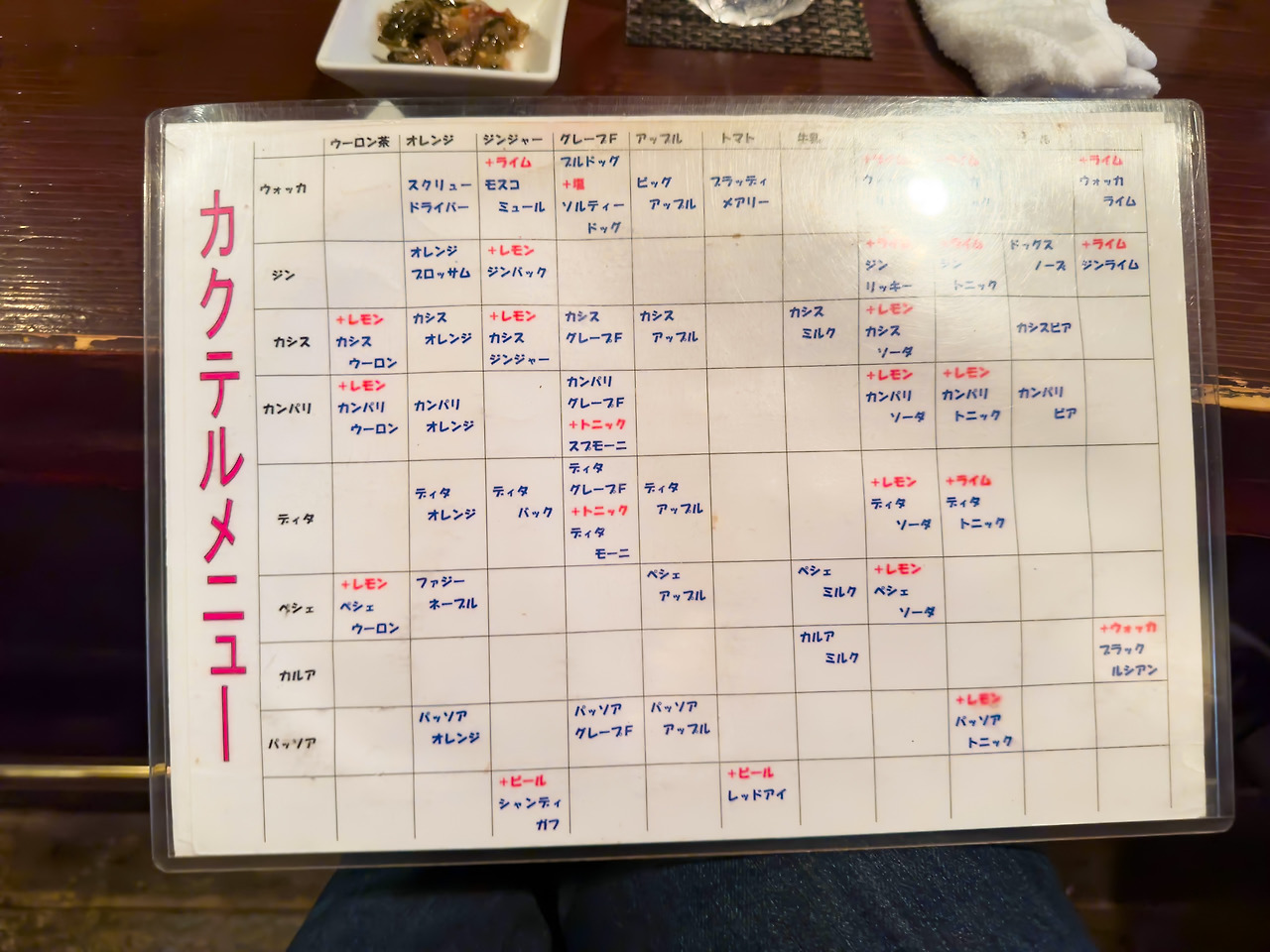 왼족에서 기주를 고르고, 위쪽에서 섞는 재료를 고른 다음 만나는 곳을 보면 그 두 개를 섞은 칵테일의 이름이 있는 식이죠. 예를 들어 맨 윗줄이 보드카(ウォッカ)를 기주로 쓰는 것들이고, 왼쪽에서 두 번째가 오렌지 쥬스(オレンジ)를 섞은 것이라서 해당 칸에는 스크류 드라이버(スクリュードライバ)가 적혀 있네요.