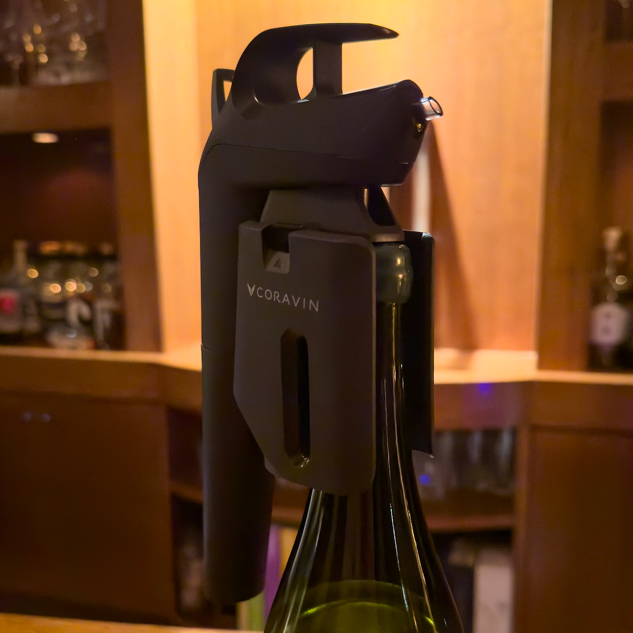 가벼운 안주를 하나 주문하고 와인도 한 잔 더 주문했는데, 와인을 따를 때 사용하는 도구가 특이합니다. 마스터한테 양해를 구하고 사진을 한 장 찍었습니다. 코르크 마개를 열지 않고 주사기 바늘 같은 것을 찔러 넣어서 안에 있는 와인을 뽑아낼 수 있는 도구더군요. 바늘을 꺼내면 코르크는 다시 원상 복구되어 막힐테니 와인을 조금씩 따라서 마시면서 오랫동안 보관할 수 있게 되는 거죠.