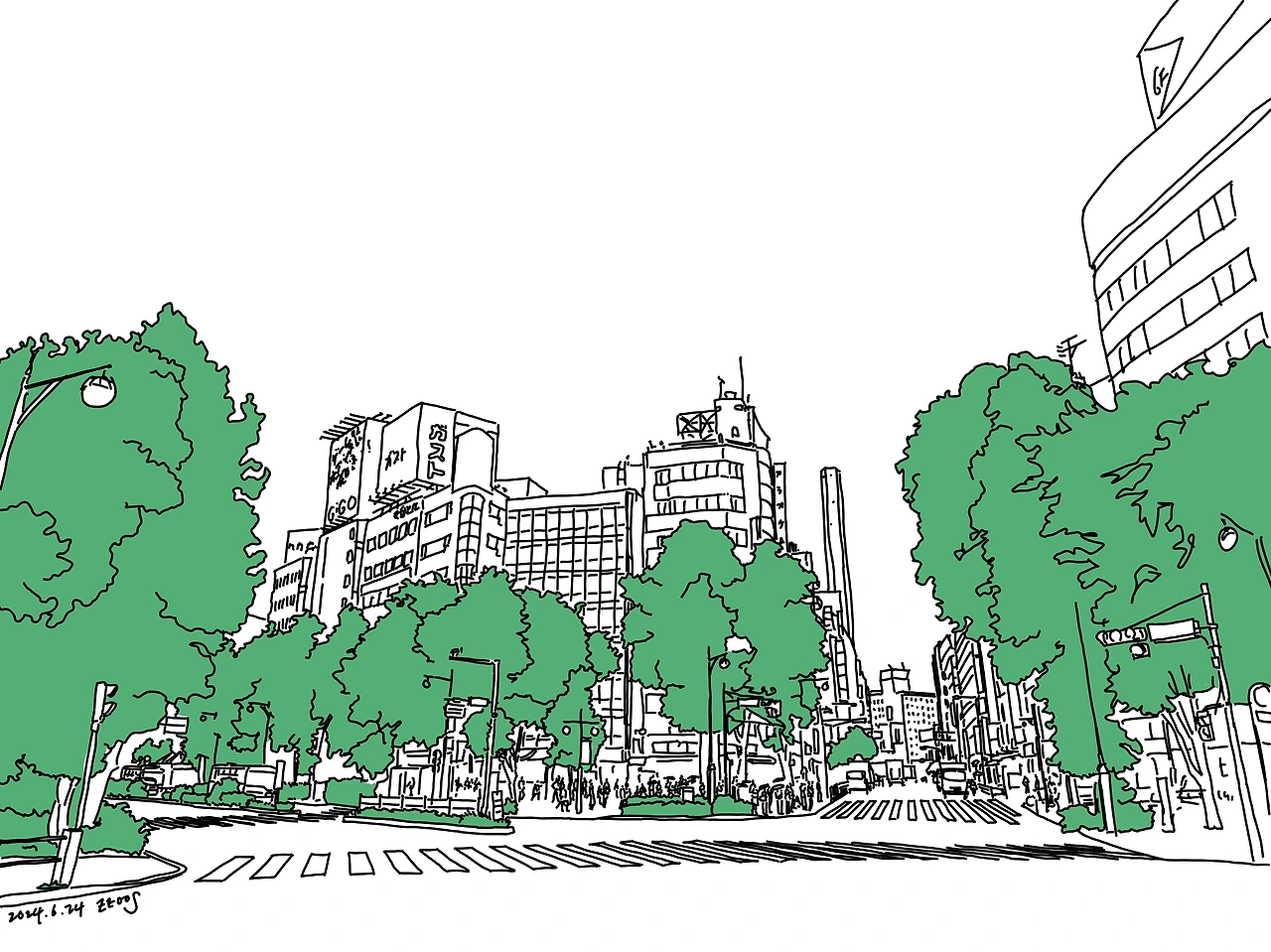 오늘은, 며칠 만에 익숙해진 거리 풍경을 하나 그렸다. 이케부쿠로 동쪽 출구 앞의 큰 교차로. 나에게 가장 강하게 남은 이케부쿠로의 인상.