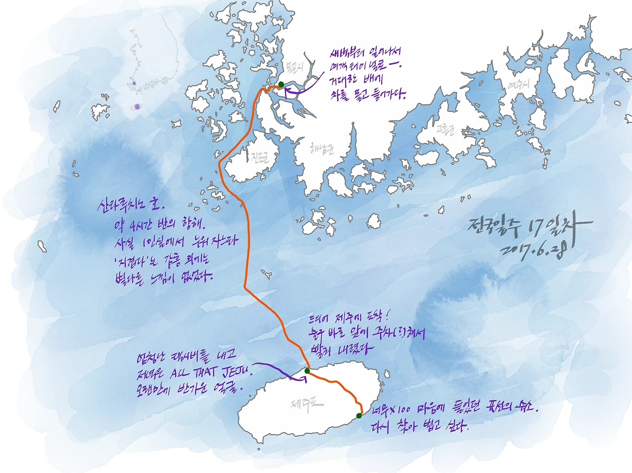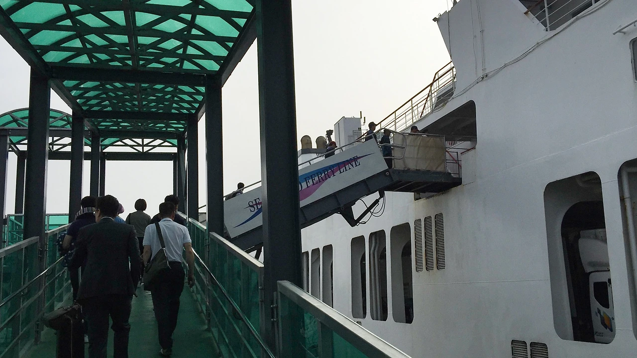 커다란 배가 생각보다 빠르게 달린다는 것은 바람을 맞으며 느낄 수 있었다. 날씨가 그리 좋지 않았지만 바다는 잔잔했다. 담배를 한 대 태우면서 바람과 바다를 구경하고, 파리바게트에서 빵을 사다가 간단하게 요기를 하고는 침대에 누워 TV를 보다가 잠이 들었다.