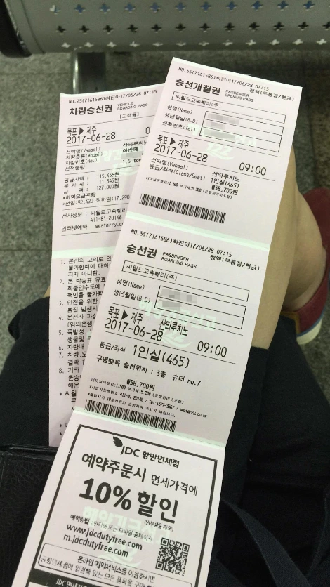 위의 사진에서 왼쪽에 보이는 게 차량승선권. 화물함에 차가 실려있다는 뜻이다. 오른쪽에 보이는 건 승선권. 처음 예매했던 표는 일반실이었는데 오늘 항해가 자그마치 다섯 시간 정도 걸릴 것 같다는 얘기를 듣고 1인실로 업그레이드해서 표를 끊었다. 참고로 예매할 때 현금으로 예매했더니 변경 발권을 할 때의 추가 요금도 현금으로 지불해야 했다. 정말 가지고 있던 현금을 탈탈 털어서 냈다. 하마터면 변경 못할 뻔. -0-
