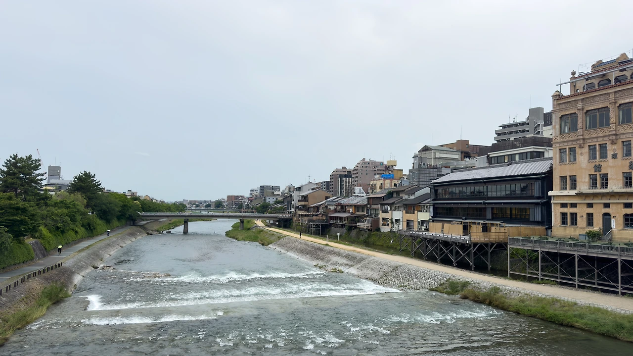 가와라마치역에 내려 카모강을 건넙니다. 뭐지? 이 묘한 반가움. 이 기분에 x100 정도 하면 고향에 돌아온 울컥과 비슷하려나. 캐리어를 끌고 약간은 두근거리는 가슴을 느끼면서 걷습니다. 아, 뭐 덥고 습하긴 하네요.