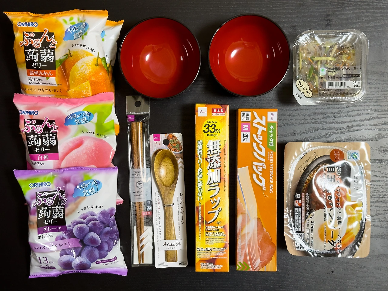 당 충전하고서는 본격적으로 장을 보러 갑니다. 사진엔 없지만 니시키 시장에서 유자 벳따라즈케와 아스파라거스 즈케를 하나씩 샀습니다. 숙소에 칼이 없을 것 같아서 벳따라즈케는 잘라서 포장해 달라고 부탁했어요. 니시키 시장 건너편으로 넘어가서 말 그대로 마트, 슈퍼마켓에 갔어요. 즉석밥, 즉석국, 치약, 쥬스, 마실 물, 과자 뭐 그런 것들을 샀어요(사진에 치약이 빠졌네;;). 보름쯤 되면 여행에서 조금은 생활로 넘어가는 단계가 아닐까요? 그래서 집에서 쓰던 짱구 장바구니도 가져왔어요.