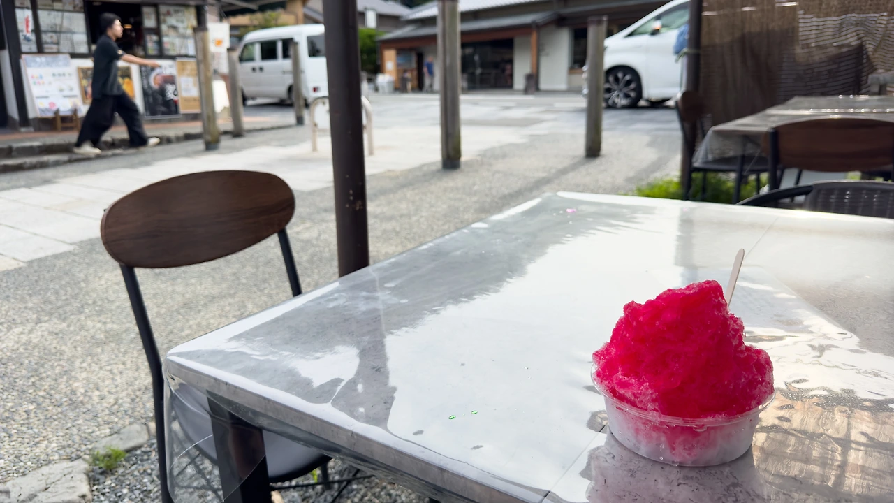 다리 건너자마자 ‘氷’ 자가 크게 보여서 바로 또 달려갔습니다. 입이 텁텁했고, 그새 또 더워졌으니까요. 카키고리, 이치고. 네, 얼음을 간 다음 딸기 시럽을 잔뜩 뿌려주는 겁니다. 우리의 빙수에는 팥앙금도 올리고 다양한 토핑이 있는데, 이건 그런 게 없어요. 대신 깔끔합니다. 그늘에 앉아서 시원한 얼음을 퍼먹으니까, 와 완전 천국!