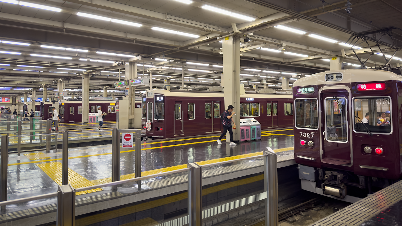오사카 우메다 역은 한큐 열차가 출발하는 역이라서 플랫폼에서 출발을 준비하고 있는 다양한 노선의 열차들을 한꺼번에 볼 수 있습니다. 사진에는 잘 안 담겼는데 이거 좀 장관입니다.
