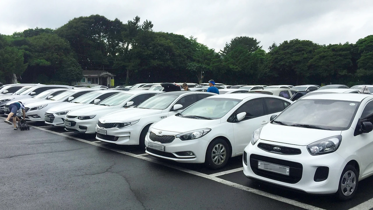 그렇게 길지 않은 비자림 산책. 딱 기분 좋은 정도. 나도 모르게 콧노래를 흥얼거릴 정도로 살짝 업된 기분으로 주차장에 왔더니 뭔가 재밌는 장면. 제주에서 여행을 하다 보면 자주 볼 수 있는 장면인데, 주차장에 가면 온통 흰색 차들이다. 렌터카는 역시 흰색이 인기가 많은가 보다.