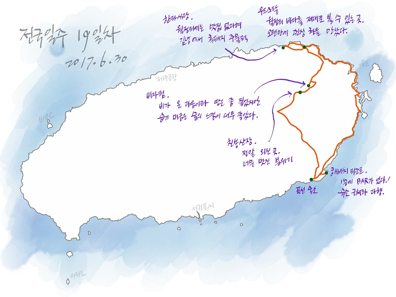 서울을 출발한 지 19일째 되는 날이자 제주에 들어와서 두 번째 맞이하는 아침. 그리고 여행을 시작한 이후 세 번째로 맞이하는 금요일. 뭐랄까 '금요일'이라는 단어는 나에게 약간의 압박감을 주는 단어다. '금요일이니까 신나게 놀아보자!'라는 식의 압박이 아니라 금요일 밤이 되도록 약속이 없으면, 그러니까 금요일을 집에서 혼자 보내면 기분이 너무 다운돼서 한없이 우울해지기 때문에 금요일에는 어떤 식으로든 약속을 만들어서 술을 한 잔 해야 하는, 그런 압박이다.