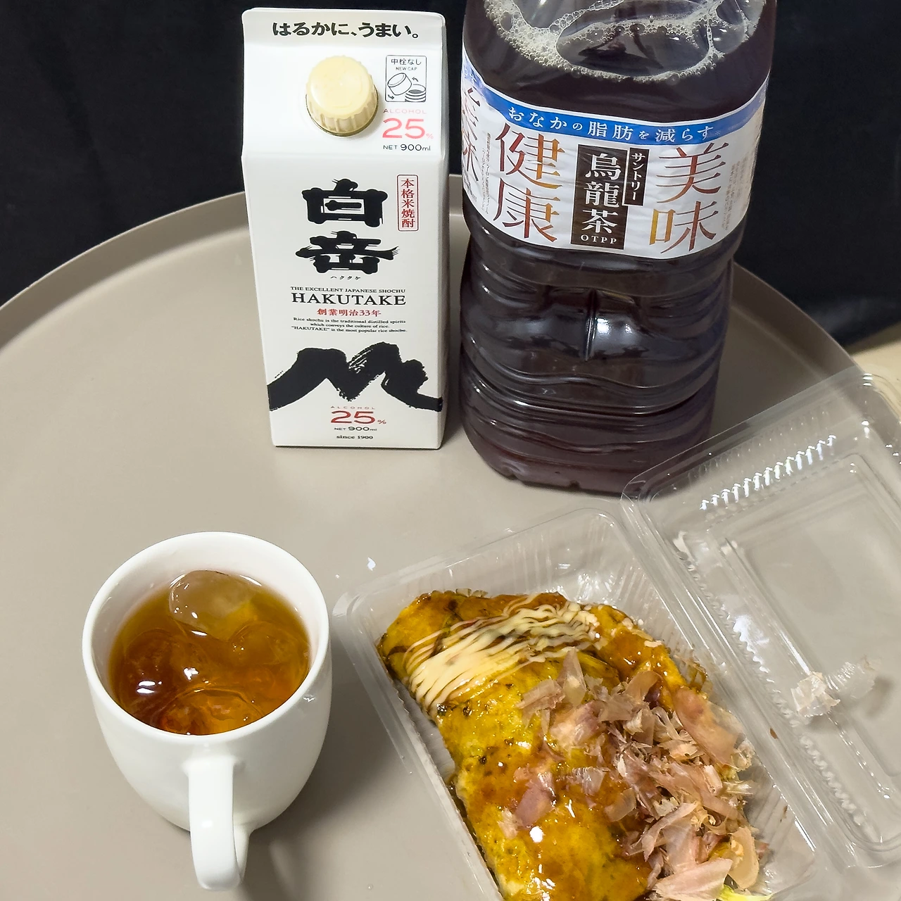 저녁 먹을 때 탄수화물이 좀 부족했으니까 오코노미야끼를 하나 사가지고 탄수화물을 보충하기로 합니다. 히로시마풍 오코노미야끼라고 쓰여 있는데, 그냥 오코노미야끼 같던데요? 뭐 여하튼 작은 것이 700엔이었으니 가성비가 좋지는 않았지만 어차피 지금 많이 먹을 수 있지는 않았습니다. 집에 들고 와서 하쿠타케에 우롱차를 섞어 ‘코메우롱’ 또는 ‘우롱하이’를 만들어 함께 먹었습니다. 그러면서 카운트다운 시간까지 따뜻하게 기다렸죠.