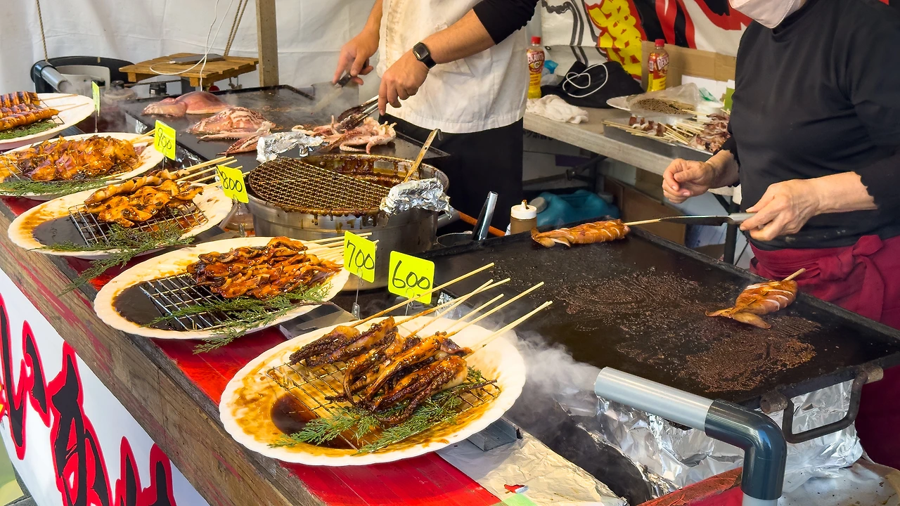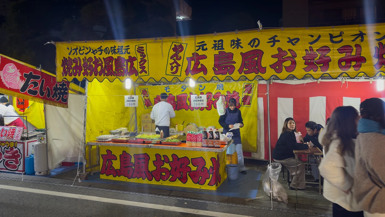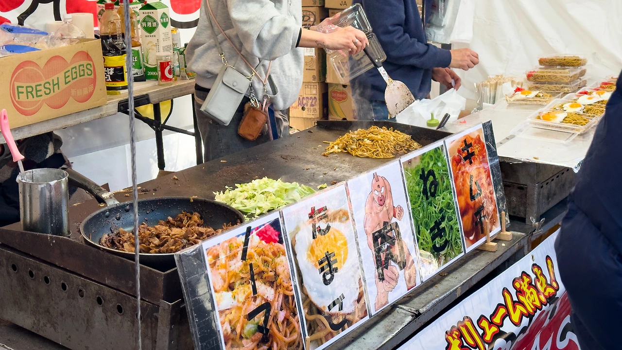 아, 저는 점심을 해결하러 나왔죠. 그래서 뭘 먹을까 여기저기 둘러보던 중 눈길을 끄는 음식은 두 가지. 하나는 야끼소바, 다른 하나는 이까야끼(오징어 구이)입니다. 하지만 이까야끼는 간식이지 점심이 될 순 없을 것 같아서 야끼소바를 하나 샀습니다.