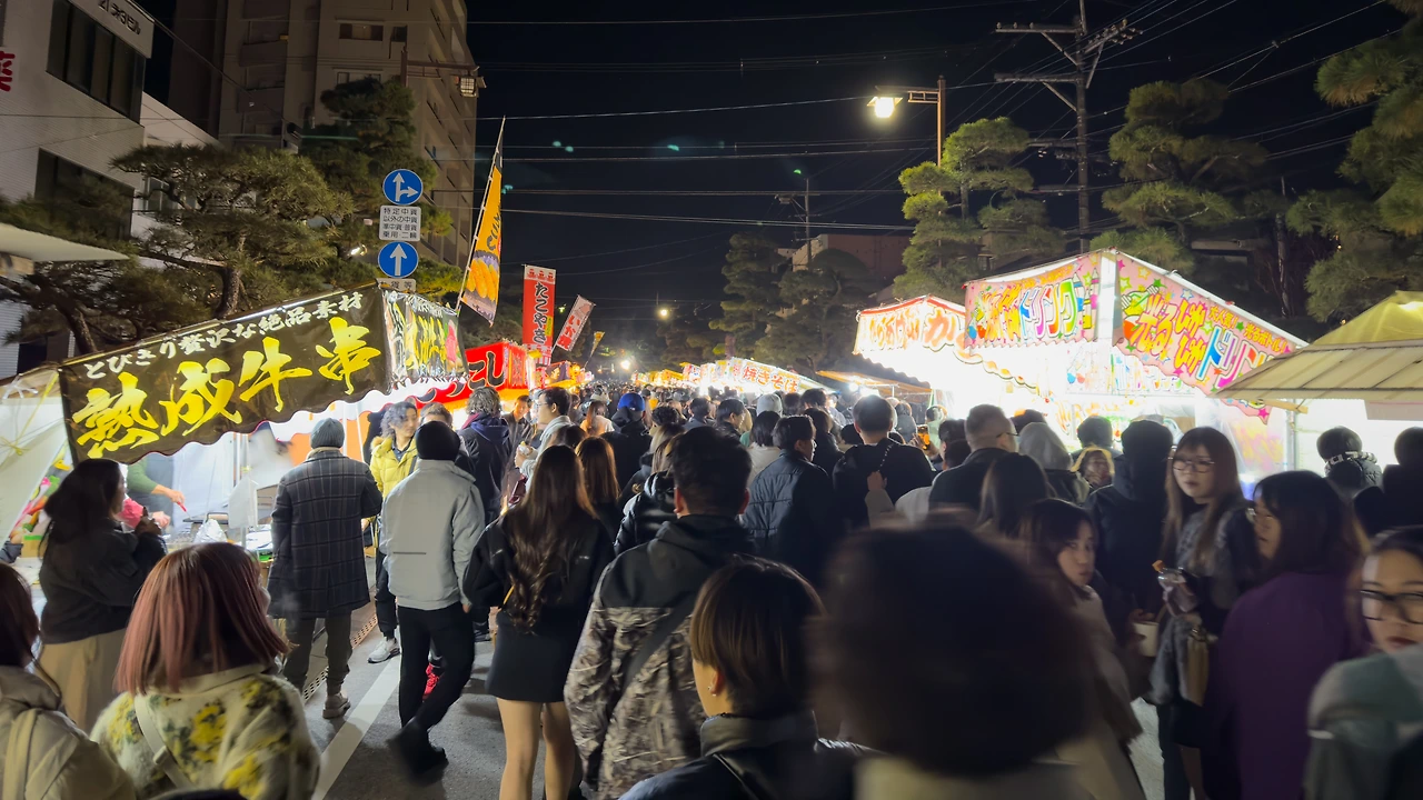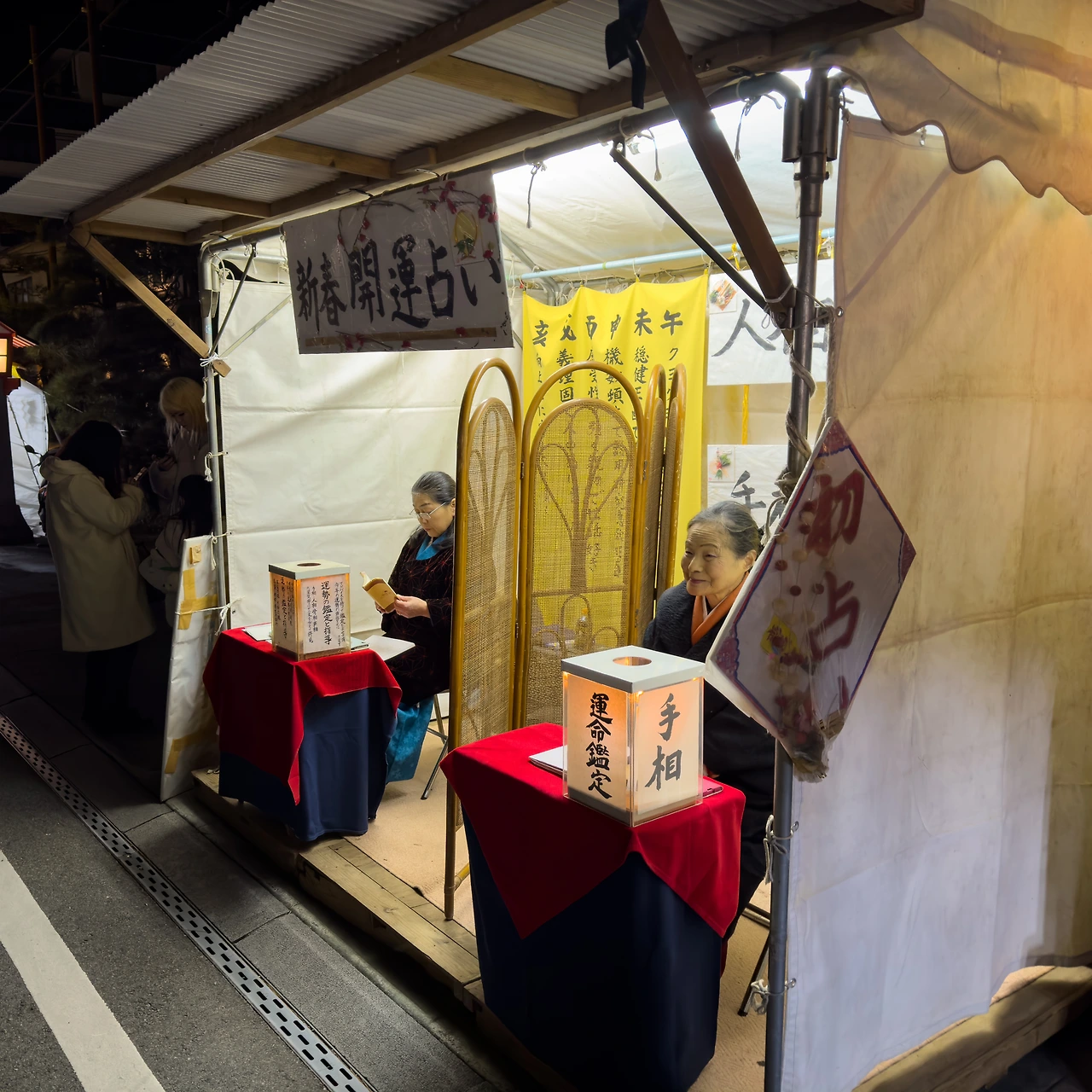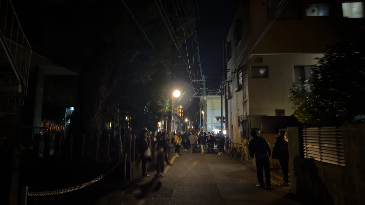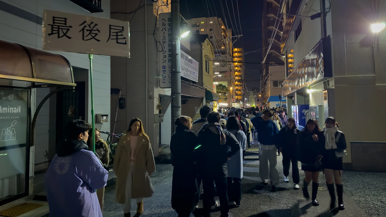 카운트다운은 12시 정각이니까, 11:30 정도에 나가보면 되겠지? 하고 슬금슬금 기어 나왔더니... 아니 이게 뭔가요!! 하치만구 앞에는 엄청난 인파가 몰려 있습니다. 신사 바로 앞부터 야타이가 늘어선 꽤나 긴 거리를 지나 골목으로 꺾어서 까지 줄을 서 있더군요. 맨 뒤에 이곳이 줄의 마지막이라는 걸 알려주는 간판까지 서 있었습니다. 이게 뭔 일인가? 생각해 보니, 12:00 정각이 지나면 1월 1일이 되잖아요? 카운트다운도 카운트다운인데 그것보다도 12:00 정각이 지난 다음 바로 ‘새해 첫 참배’를 하기 위해 모여든 사람들입니다.