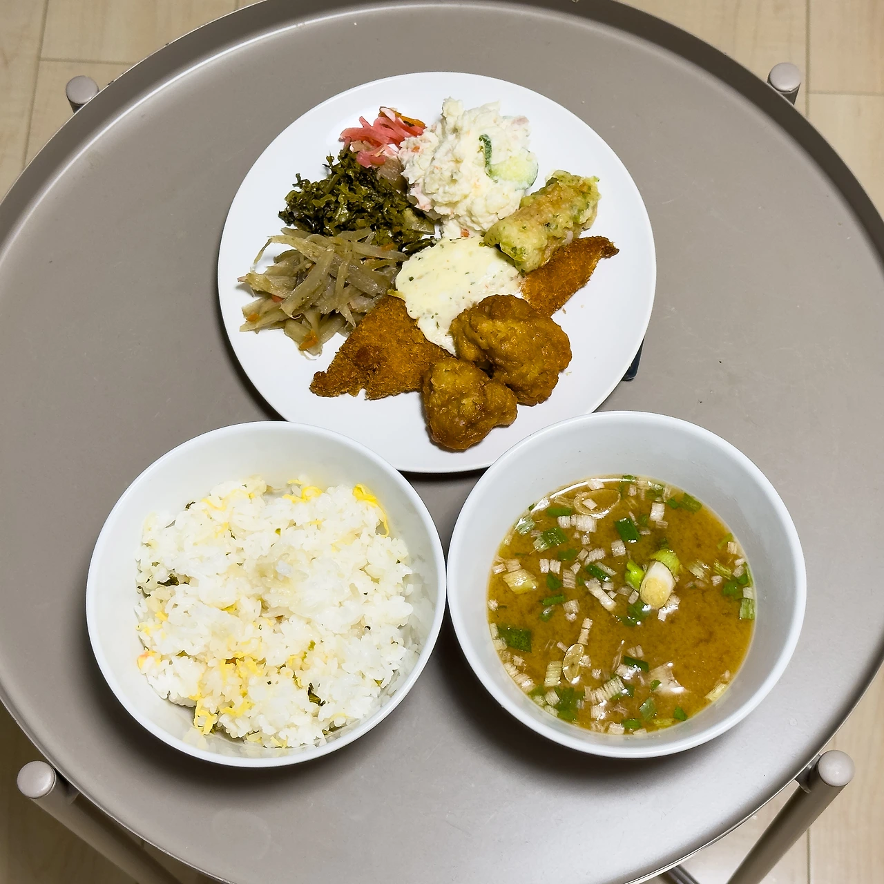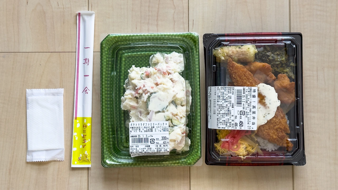 자, 이제 사 온 것들로 저녁을 차려 먹습니다. 된장국은 미리 사두었던 즉석 된장국입니다. 뜨거운 물만 부으면 되는 거죠. 도시락에 반찬이 많길래 야채 사라다와 갓절임만 추가했습니다 쯔께모노들은 아직 꺼내지 않았어요. 이 정도면 훌륭한 밥상이죠. 하지만 가격이 절대 저렴하지는 않습니다. 도시락이 450엔이니까요. 간단하게 먹을 때는 더 저렴하게 먹는 방법도 생각해 봐야겠는데... 아무래도 500엔 아래로 만드는 것이 쉽지는 않습니다. 직접 요리하지는 않으니깐 말이죠.