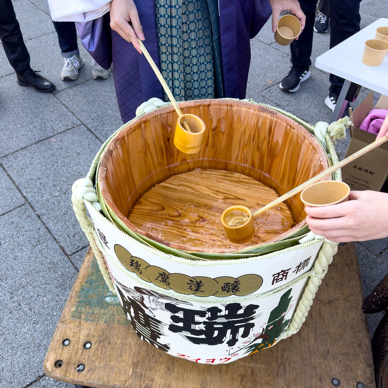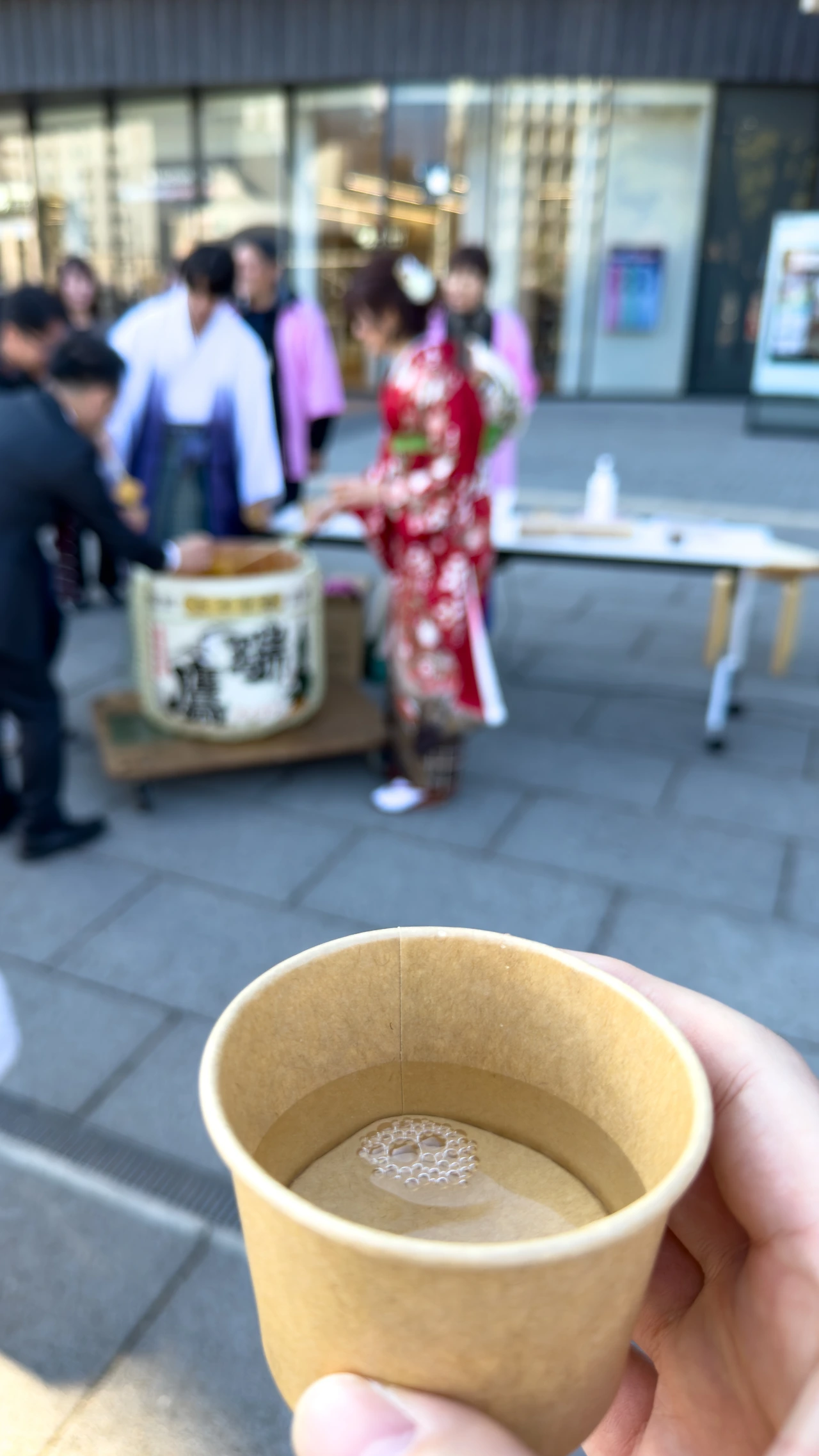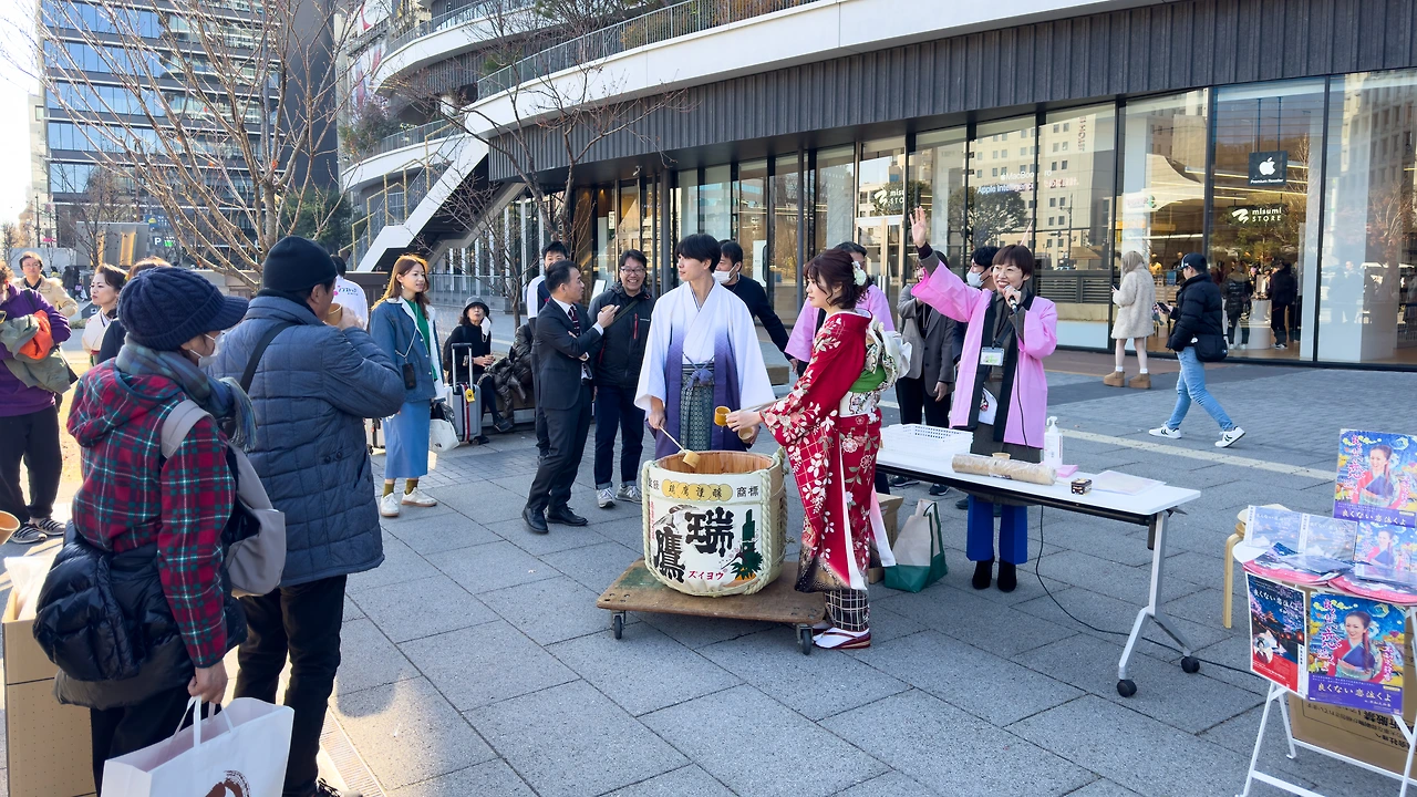 어라? 쇼핑몰 앞에서 뭔가 행사를 하고 있습니다. 마이크를 든 여자분께서 ‘후루마에자케’라면서 다들 와서 드시라고 방송을 하고 있고, 멋진 옷을 차려 입은 젊은 남녀가 종이컵에 니혼슈를 떠서 나눠줍니다. 후루마에자케가 뭔지 나중에 여기저기 물어봤더니 후루마이자케(振る舞い酒)란 새해를 맞이해서 다 같이 즐겁게 마시는 술이라는 뜻이라고 합니다.