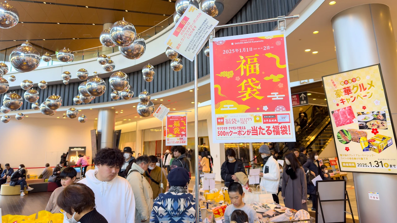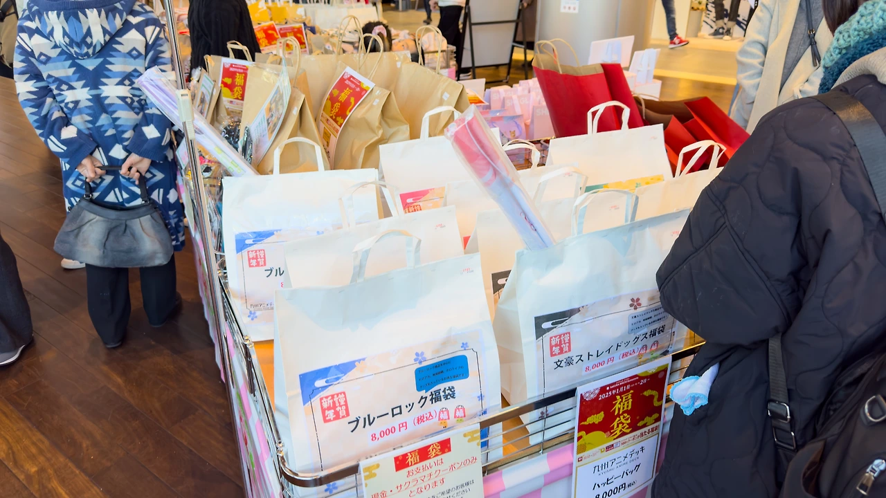 쇼핑몰 안에 들어가니 특별 매장 같은 게 있습니다. 이런저런 매장에서 만든 후쿠부쿠로(福袋)를 모아서 판매하는 매대인 것 같았어요. 후쿠부쿠로 그러니까 복주머니란 일본의 새해 첫날에만 판매하는 특별한 판매 방식인데요. 해당 매장의 상품이 랜덤으로 들어있는 주머니입니다. 예를 들어 5천 엔짜리 후쿠부쿠로를 사면, 안에 뭐가 들어있는지는 알 수 없지만 어쨌거나 5천엔 보다는 훨씬 비싼 값어치의 물건들이 들어 있는 식이죠.