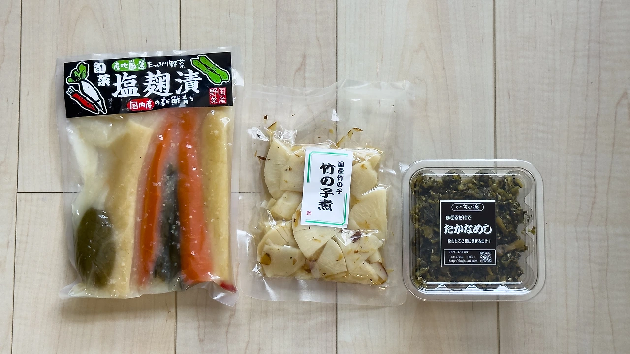 자, 이제 집에 돌아와서 무엇을 샀는지 체크해 봅니다. 우선은 고쥬안에서 산 쯔께모노들입니다. 무, 당근, 오이 등을 절인 것이죠. 가운데는 죽순을 다시에 절인 것입니다. 이건 짠맛이 아니라 가쓰오부시의 감칠맛이 나는 절임이에요. 세 번째 것은 타카나메시 그러니까 갓 볶음밥을 만들기 위한 갓 절임입니다. 구마모토의 음식 중 하나라고 하네요. 아소산에서 자란 갓(타카나)을 쓴다고 합니다. 원래는 저걸 볶아서 밥이랑 섞어 먹는 거라는데, 저는 그냥 절임 상태 그대로 먹습니다.