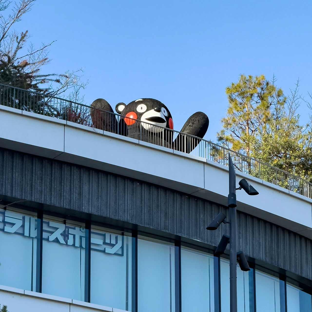 잠깐 광장에 서서 한 잔 마시다 보니 자연스레 고개가 위로 들리면서 사쿠라마치 건물의 위쪽을 보는데, 어라? 저게 뭐지? ㅎㅎㅎ 쿠마몬이 위에서 반겨주고 있네요.