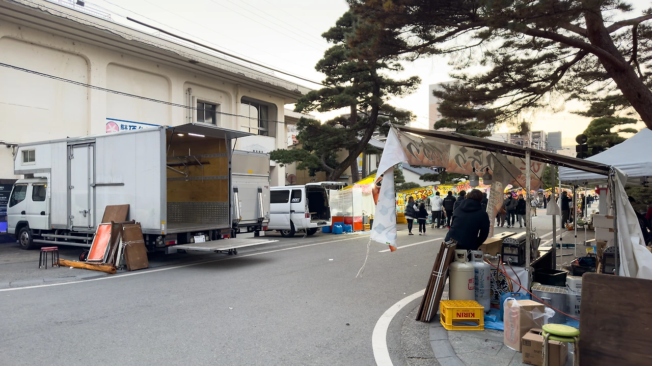그러다가 문득 달력을 봤더니, 오늘 금요일이더라구요??? 아, 제 몸의 유전자(?)가 반응해 버립니다. 금요일 밤에 집에 처박혀 있는 것은 스스로를 슬프게 만드는 일입니다. 어디를 가던 일단 나가서 먹어야겠습니다. 그렇게 집 앞으로 나와 보니 12월 31일 밤부터 영업하던 야타이들이 오늘은 철수를 시작하네요. 아하, 1월 1일까지만 영업하는 게 아니었군요. 총 3일 정도를 영업하는 모양입니다.