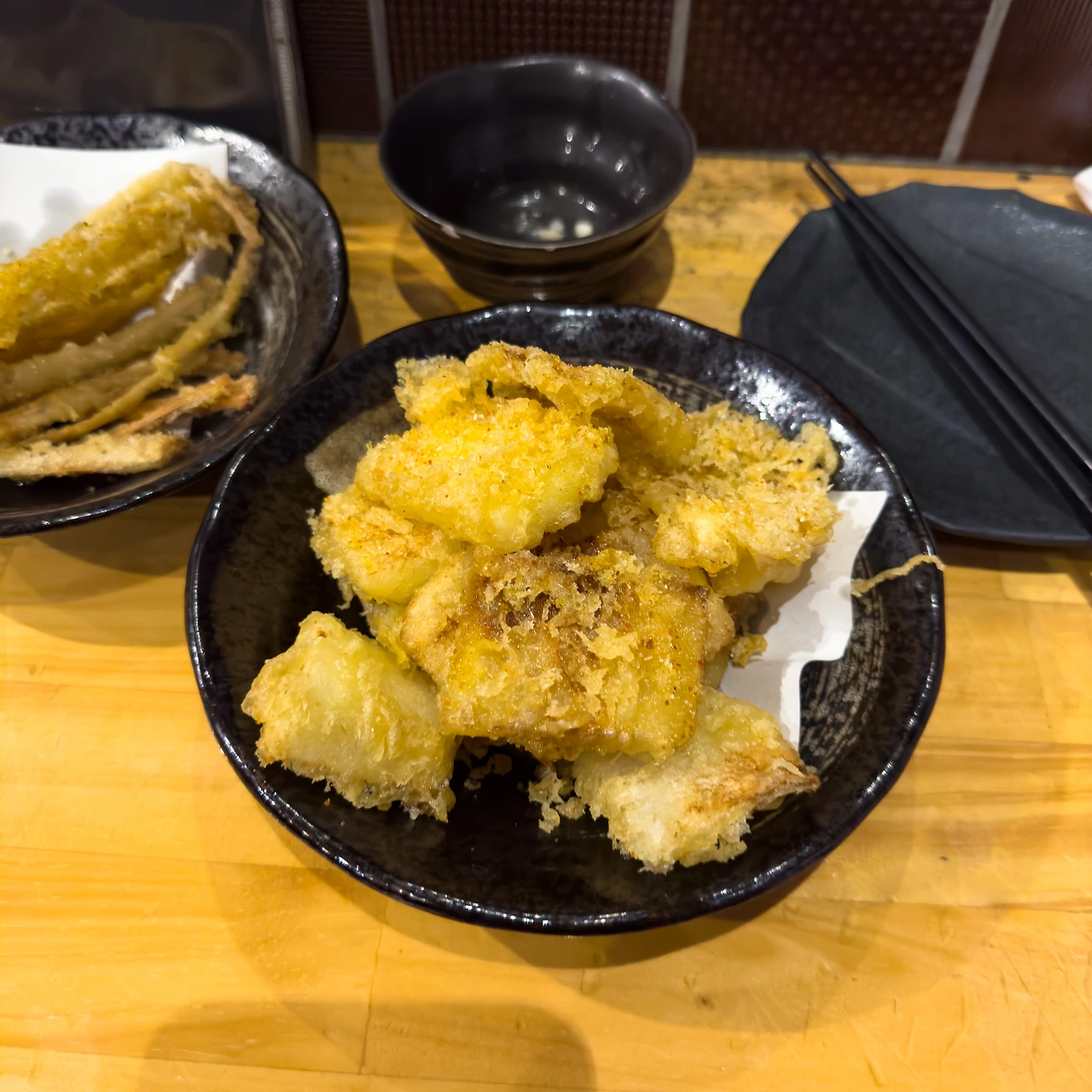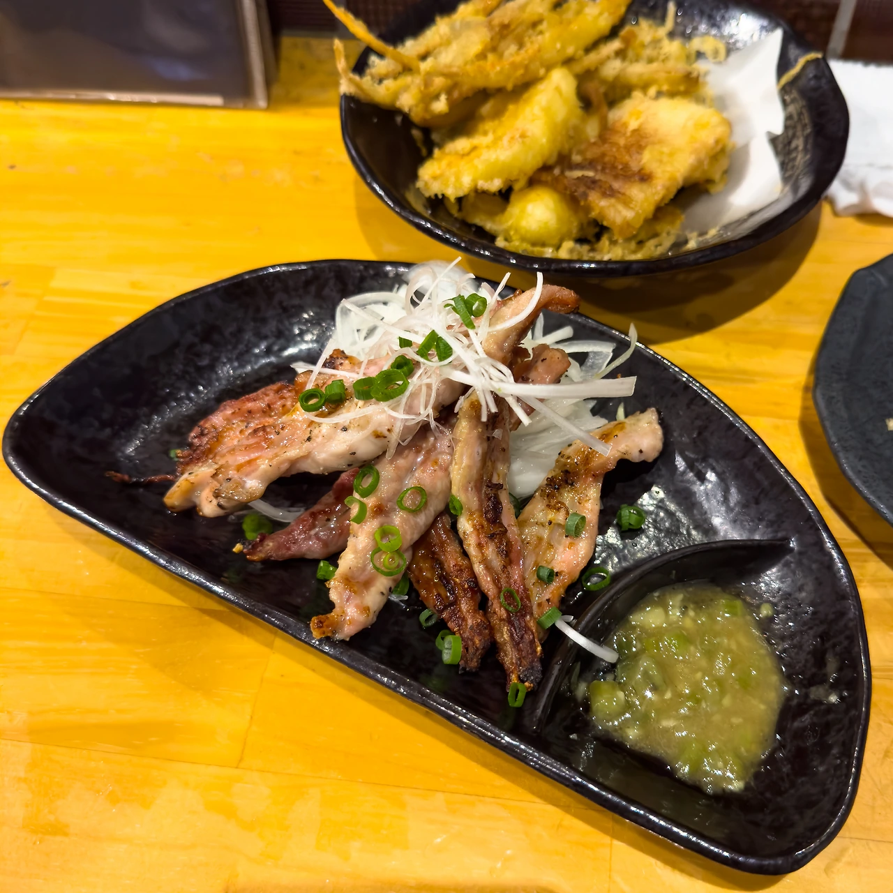 하지만 문제는 제가 야마이모 튀김도 주문했다는 겁니다. 두 메뉴의 맛이 너무 비슷하고 짭짤해서 좀 지겨웠어요. ㅠㅜ 다행히 그다음 메뉴인 닭목살 구이를 상큼한 유즈코쇼와 함께 먹었더니 짠 기운들이 많이 사라지더군요. 다음부터 튀김 메뉴는 하나만 주문해야겠습니다.