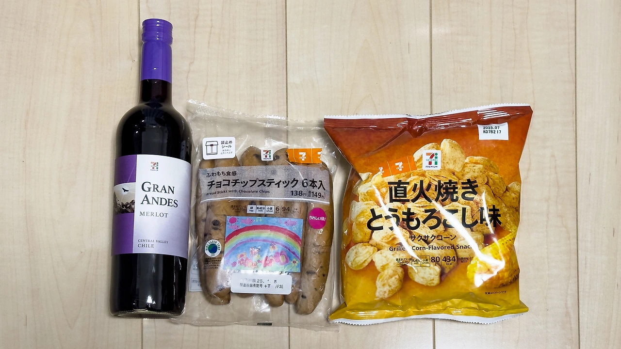 금요일 밤! 이라는 기분이 좀 사그라들어서 그냥 집으로 들어왔습니다. 오는 길에 편의점에 들러 빵과 과자를 샀어요. 그리고 자그마치 500엔짜리 와인이 있길래 한 병 사봤습니다. 세븐 일레븐은 가성비가 좋으니까요.