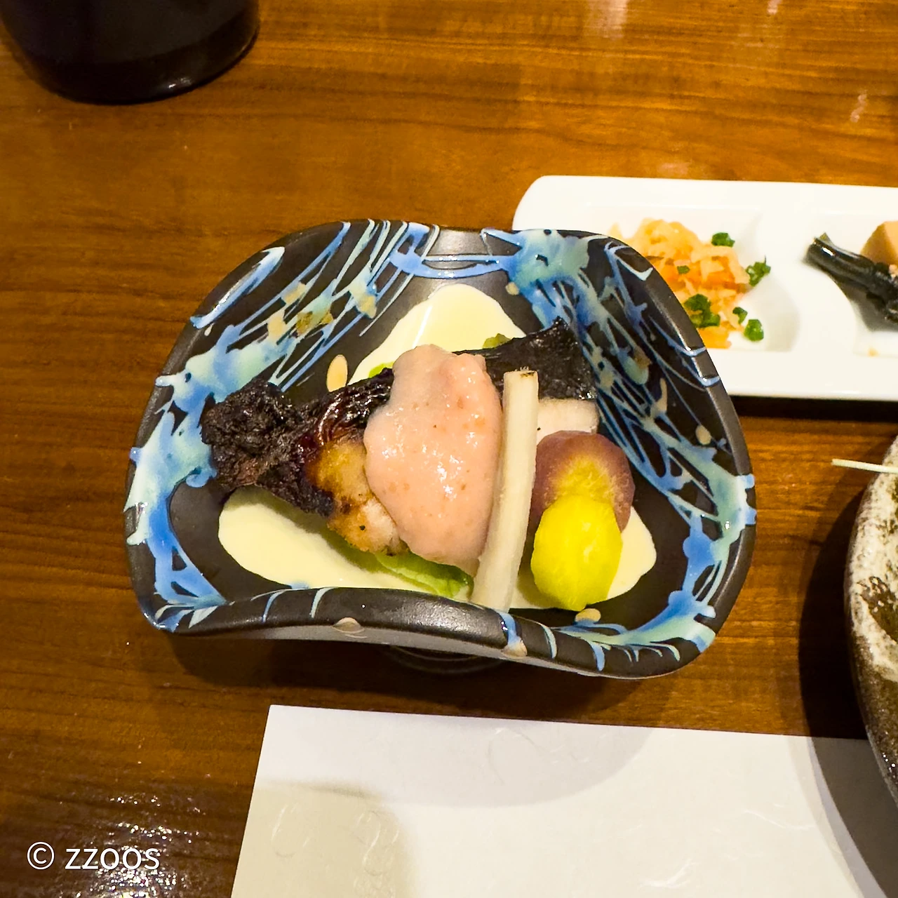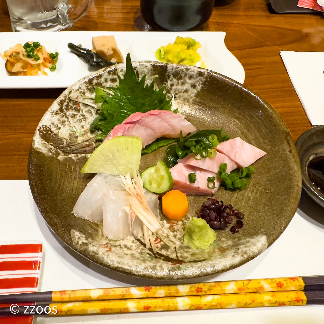한국에서도 쉽게 마실 수 있는 것이긴 하지만 오랜만에 청량하게 다이야메 소다와리로 시작했습니다. 목을 축이고 있으니 먼저 사시미 한 접시가 나오더군요. 도미, 방어 등살, 방어 뱃살이었던 것 같습니다. 뭐랄까, 방어의 기름 느낌이 평소에 먹던 것과 좀 다릅니다. 숙성 때문인가? 아니면 방어가 아니라 간파치나 여튼 뭐 좀 다른 애였을까? 여튼 사시미는 뭐, 그냥 평범했습니다.