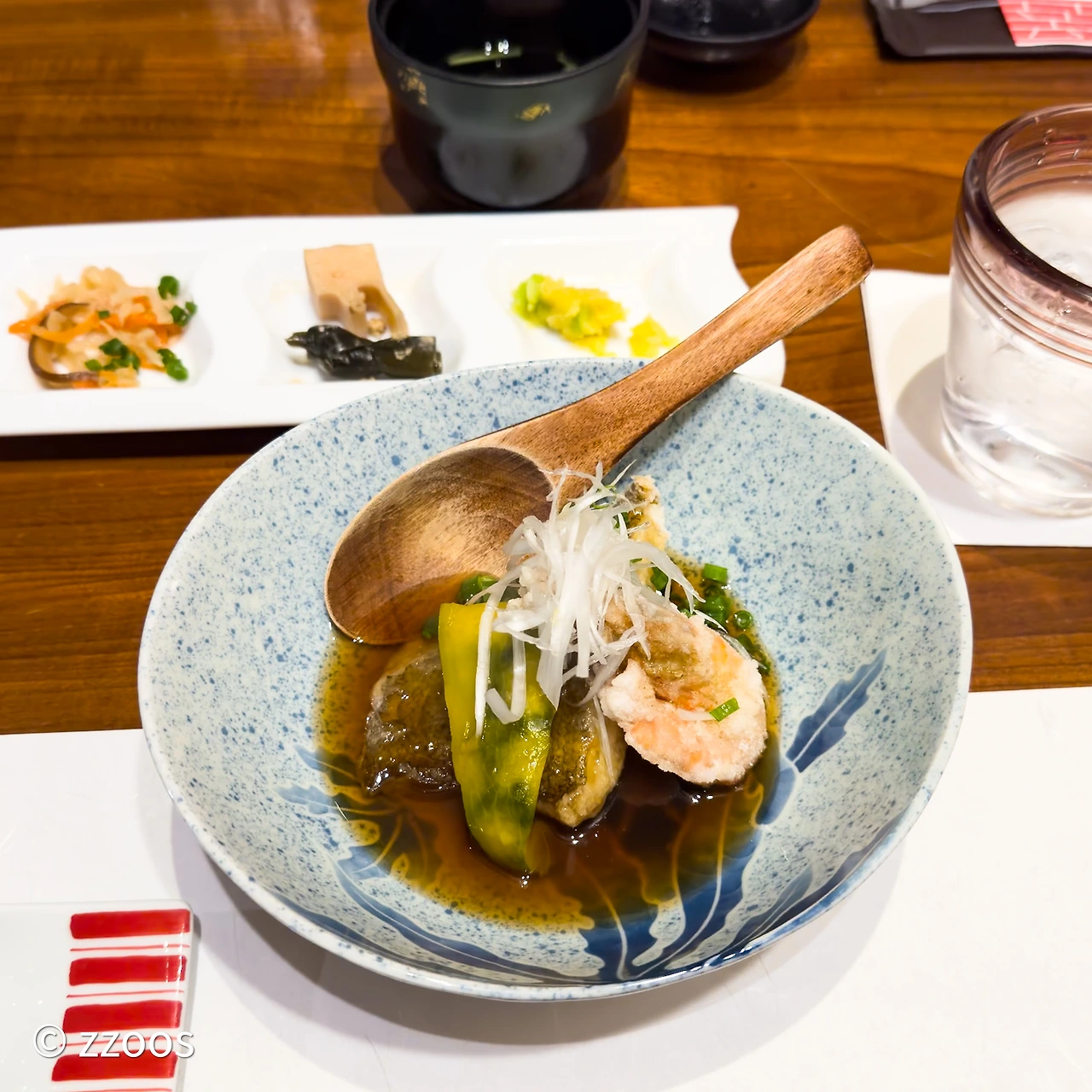 다음으로 나온 음식은 통통한 가자미 같은 생선의 조림이었습니다. 달달하고 끈적한 육수 위에 작은 새우튀김도 하나 올라가 있네요.
