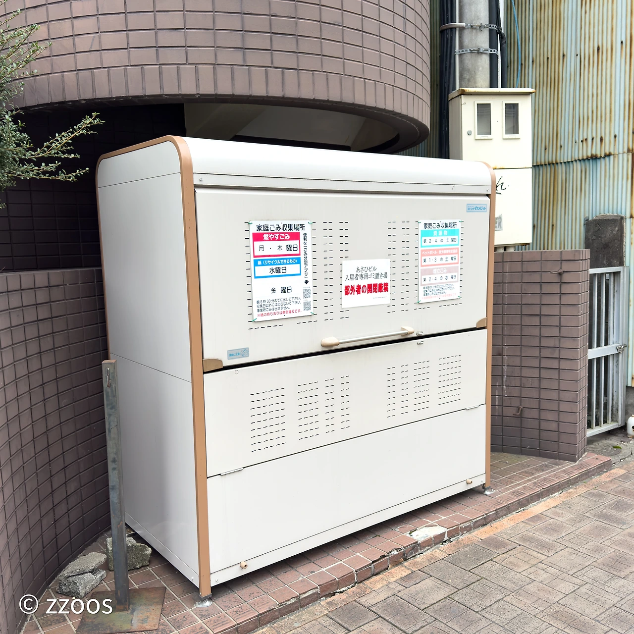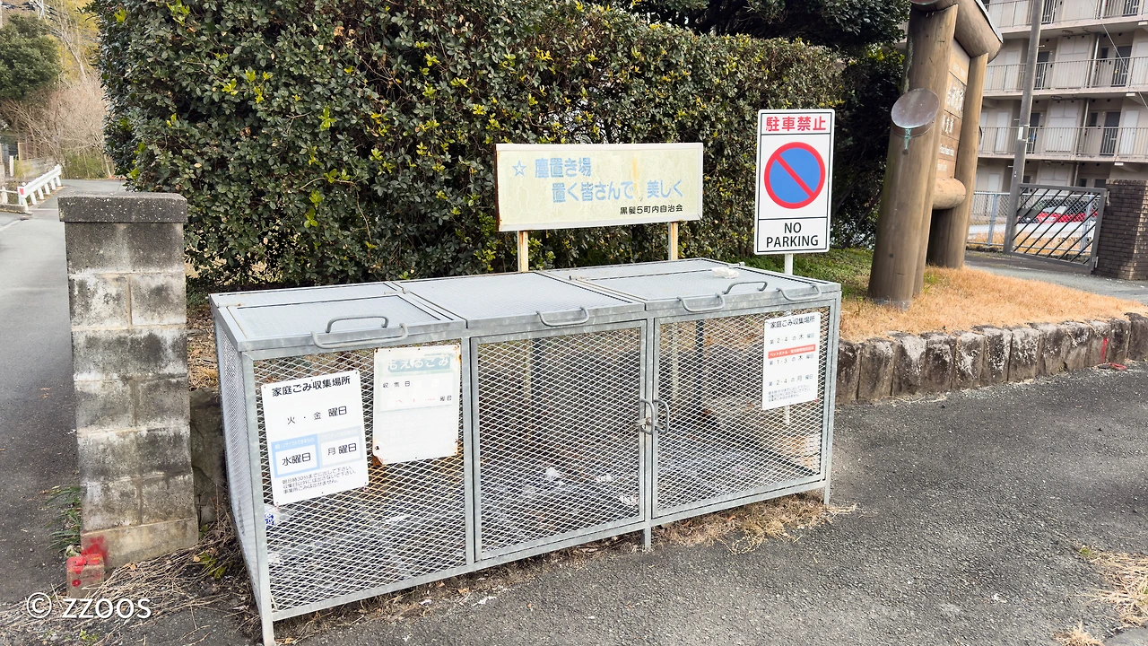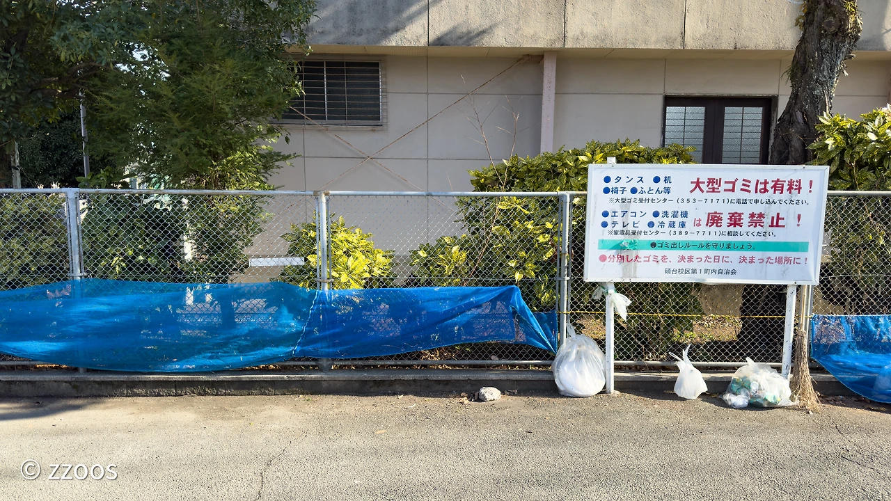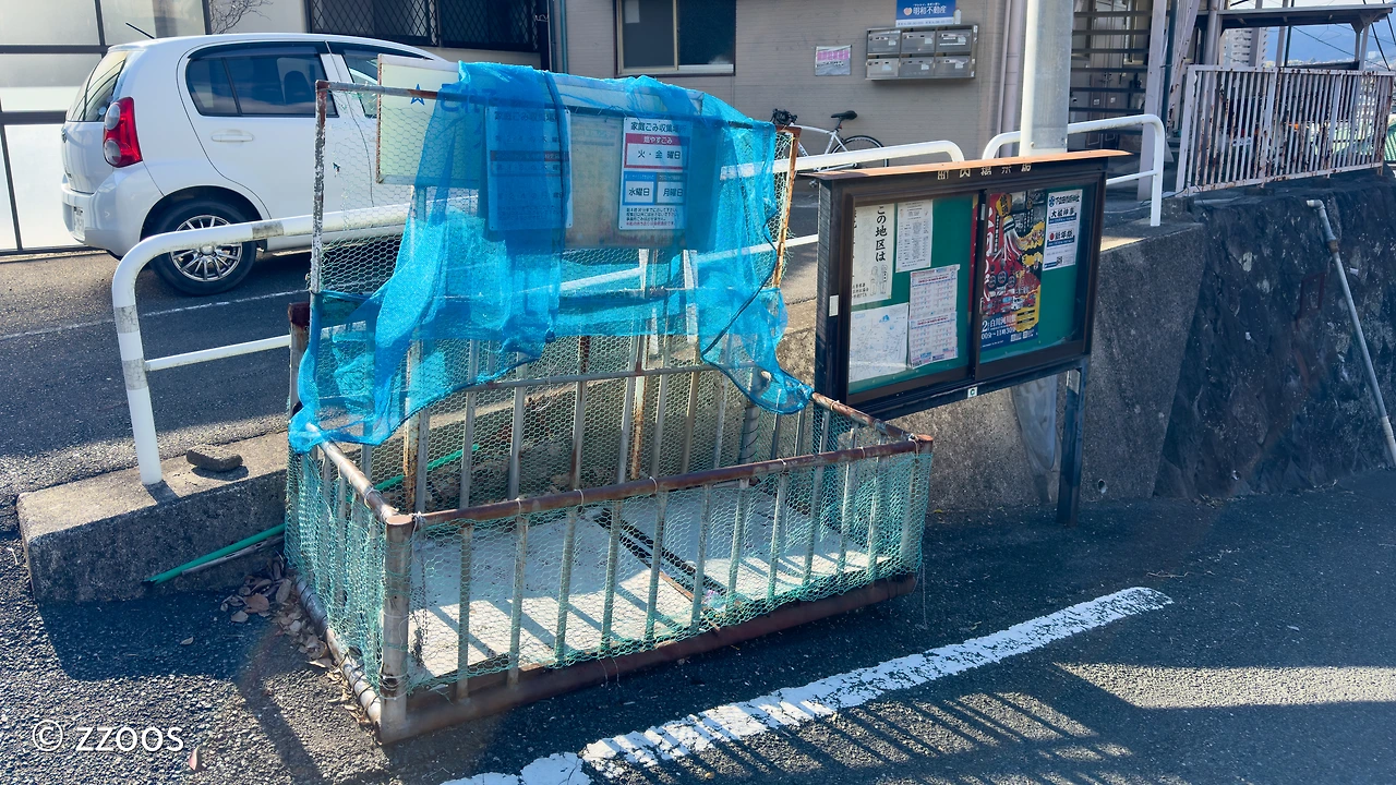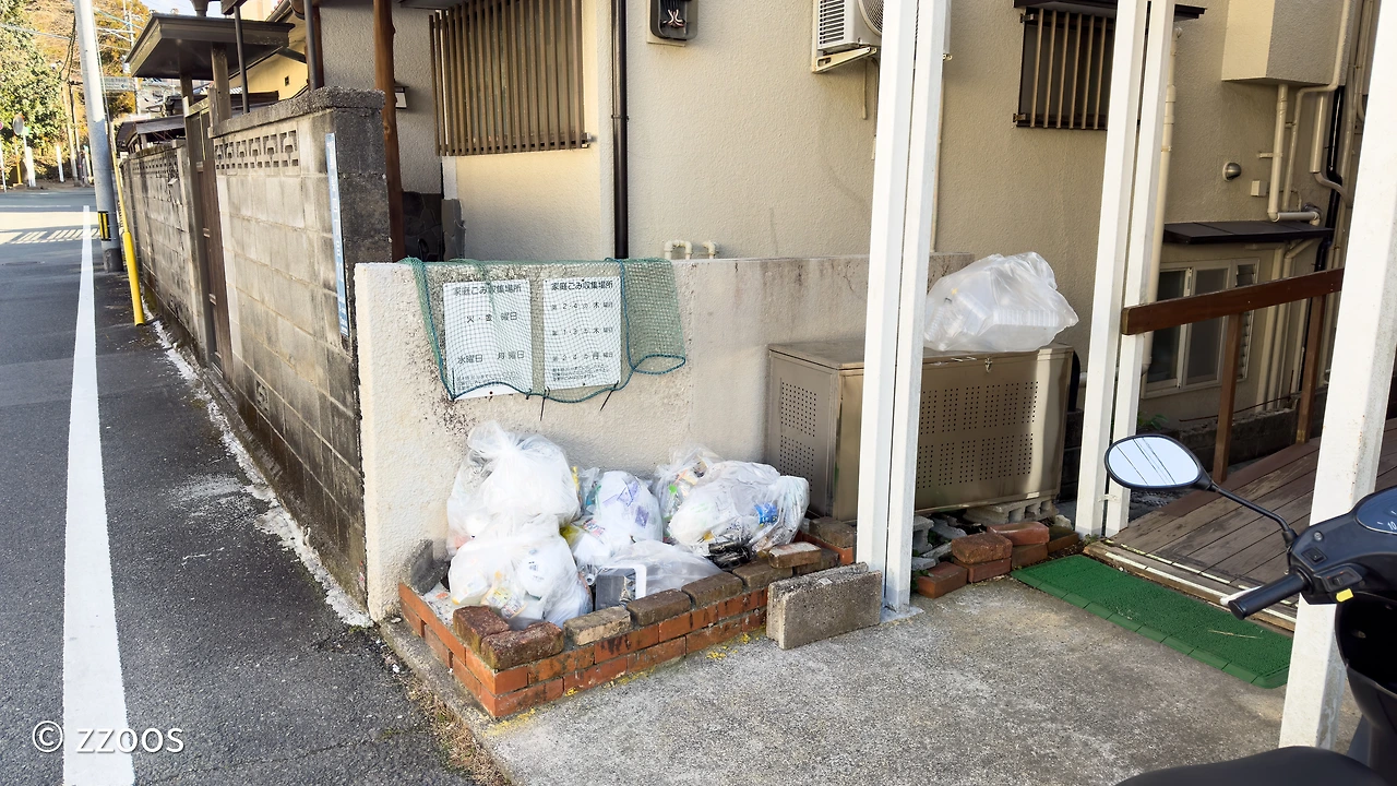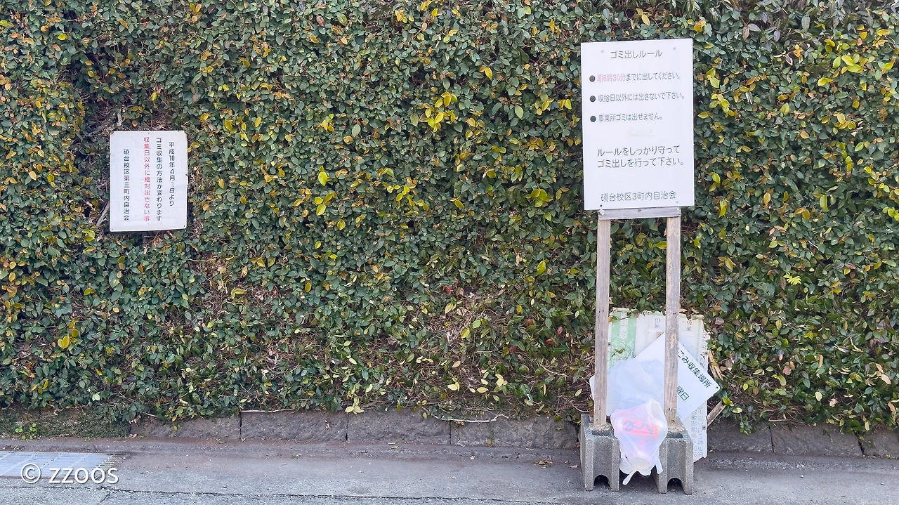 이렇게 보니까, 누가 봐도 쓰레기 버리는 곳 같이 생기긴 했죠? 동네 구석구석에 다양한 모양으로 만들어져 있긴 하지만 잘 보면 안내문도 붙어 있고, 쓰레기 배출 장소인 것을 알 수 있습니다. 주택가에는 그냥 구역을 대충 만들고 비닐망을 덮어둔 곳이 많은데요. 고급 맨션일수록 좀 더 깔끔하게 구역을 나눠두는 등 신경을 쓴 모습도 보입니다.