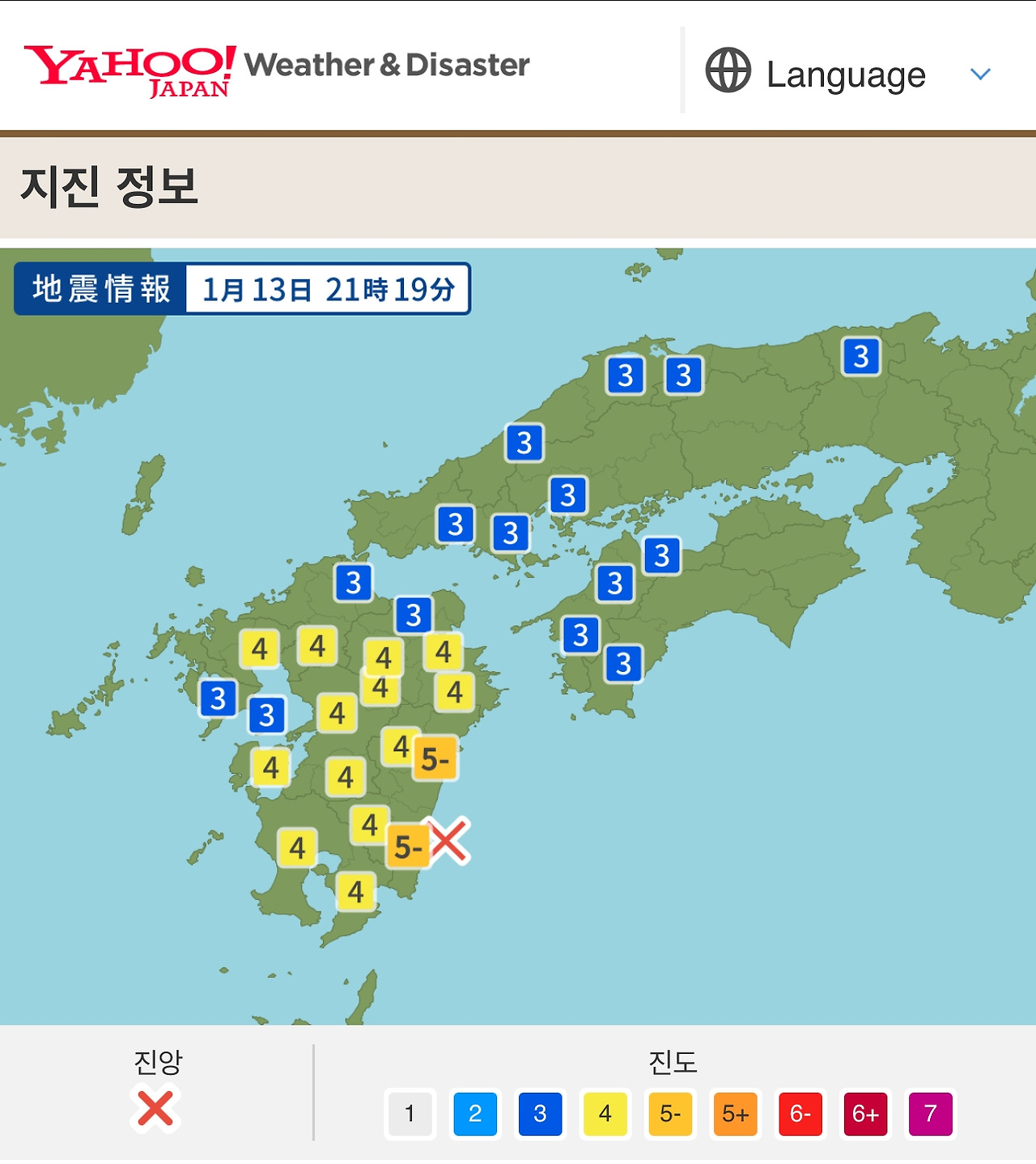 이곳에서 좀 더 자세한 정보를 알 수 있었어요. 미야자키현 앞바다가 진앙이고, 미야자키는 진도 5 정도. 구마모토는 진도 4 정도의 지진이었더군요.