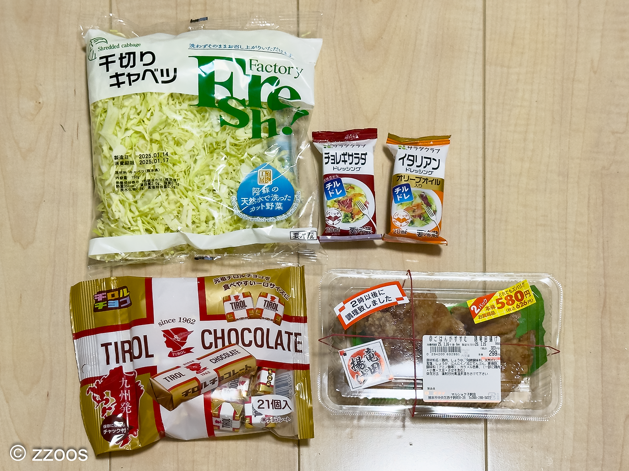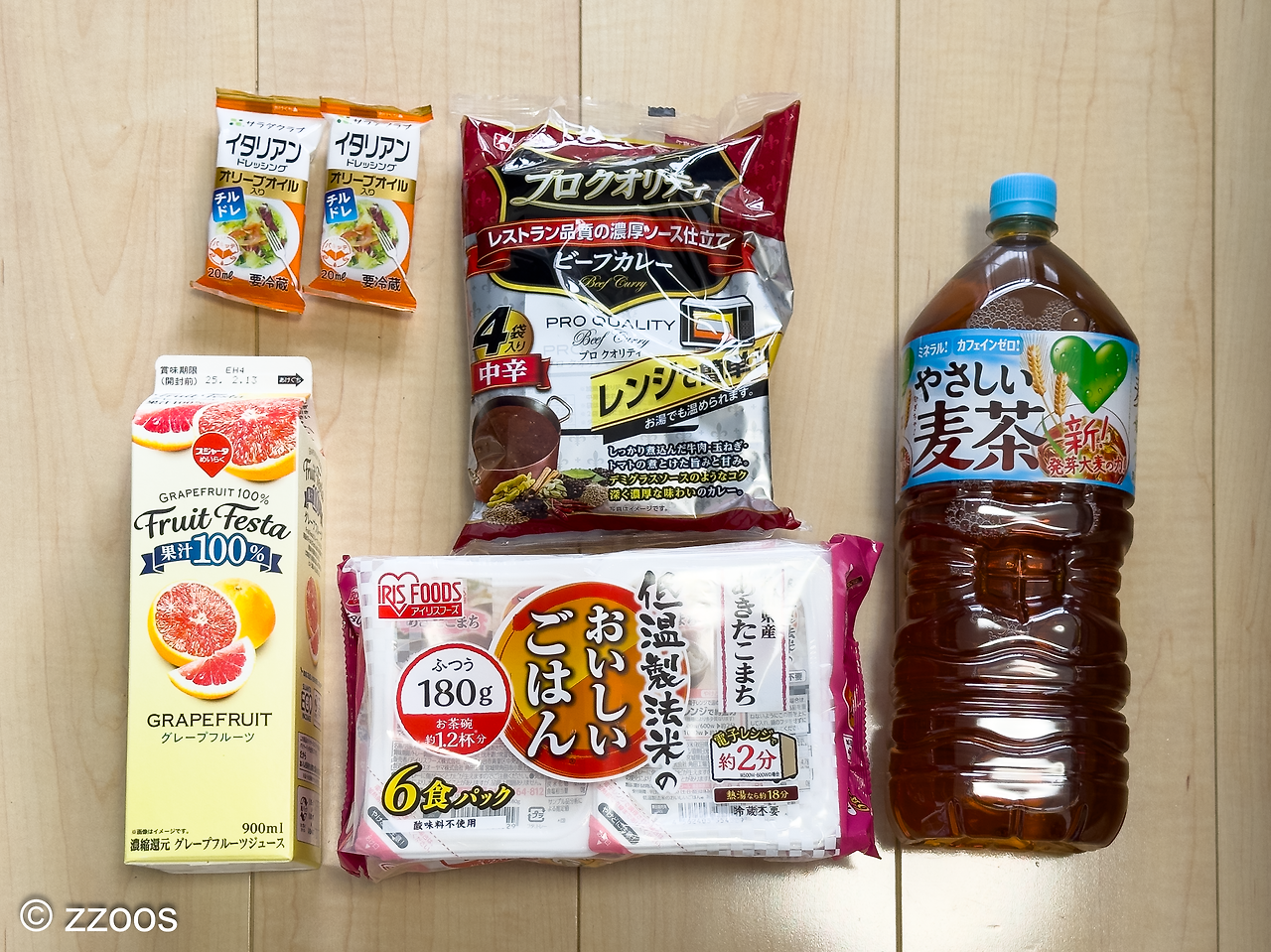 양배추는 남았는데 드레싱은 다 먹어버려서 드레싱을 추가로 구매하고, 카레와 즉석밥도 보충했어요. 세븐일레븐의 오렌지 쥬스가 질려서 이번엔 슈퍼마켓에서 자몽 쥬스를 샀고요.