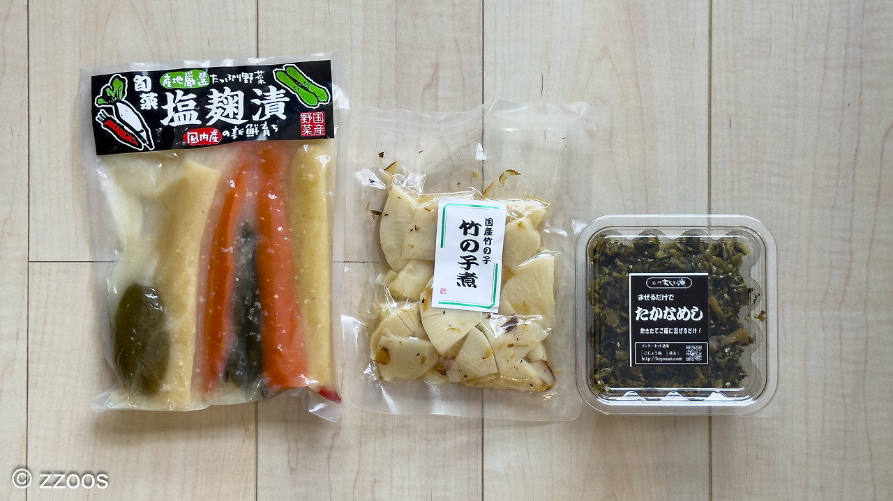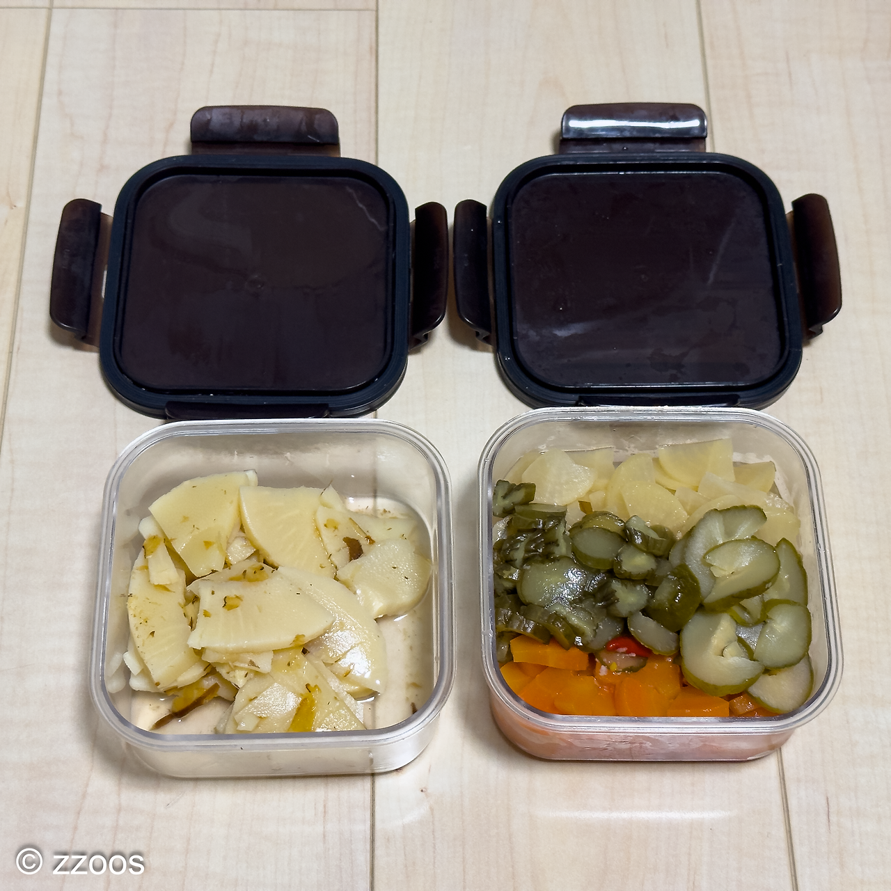 아무래도 집에서 뭔가 차려먹으려면 밑반찬이 필요하더라고요. 그래서 사쿠라마치 지하의 진미 고쥬안(珍味古じょう庵)에 가서 쯔께모노랑 죽순 절임이랑 타카나메시(잘게 썬 갓을 절인 것, 밥과 함께 볶아 먹는 용도)를 사다가 반찬통에 담고, 냉장고에 넣어두었습니다. 참고로 반찬통은 집에서부터 공수해 간 것이에요. ㅎㅎ