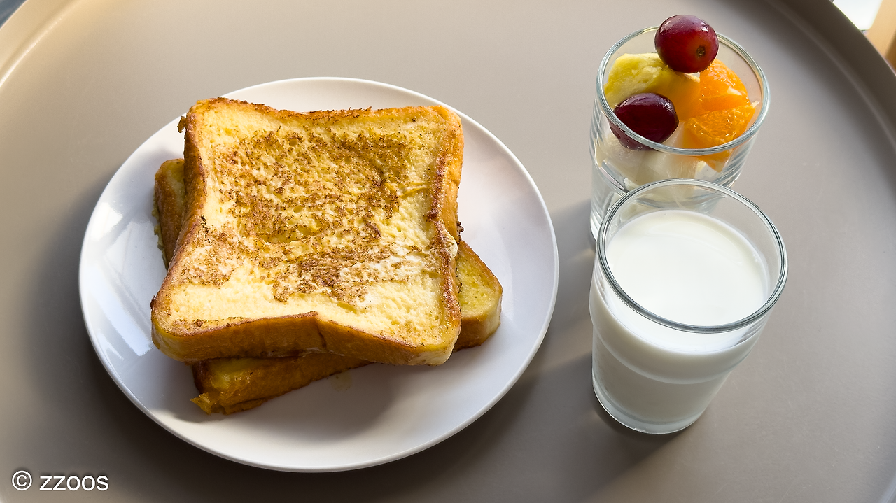그렇게 처음으로 밥을 차려 먹습니다. 즉석 미소시루도 만들고요. 밥은 도시락에 들어 있던 것을 데우기만 했네요. 그리고 어떤 날의 아침은 드디어 프렌치토스트를 만들어 봅니다. 계란과 우유를 섞고 식빵을 푹 적신 다음 버터를 바른 팬에 굽기만 하면 되는, 간단한 아침입니다.