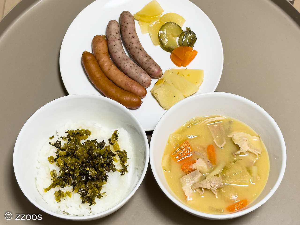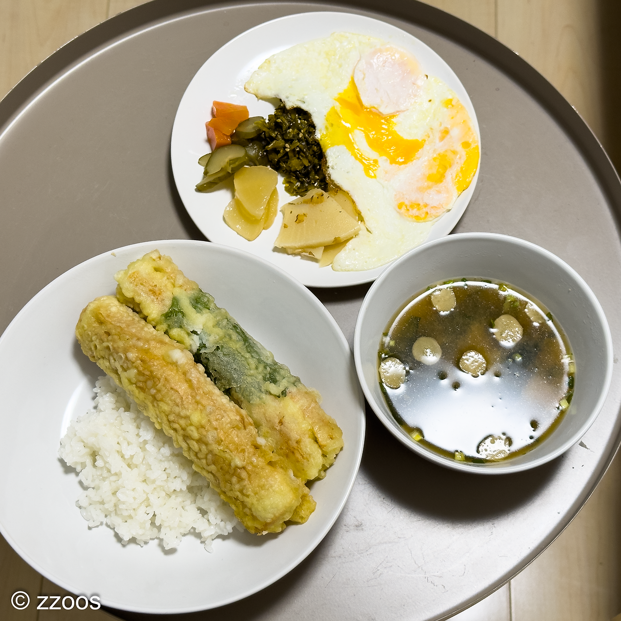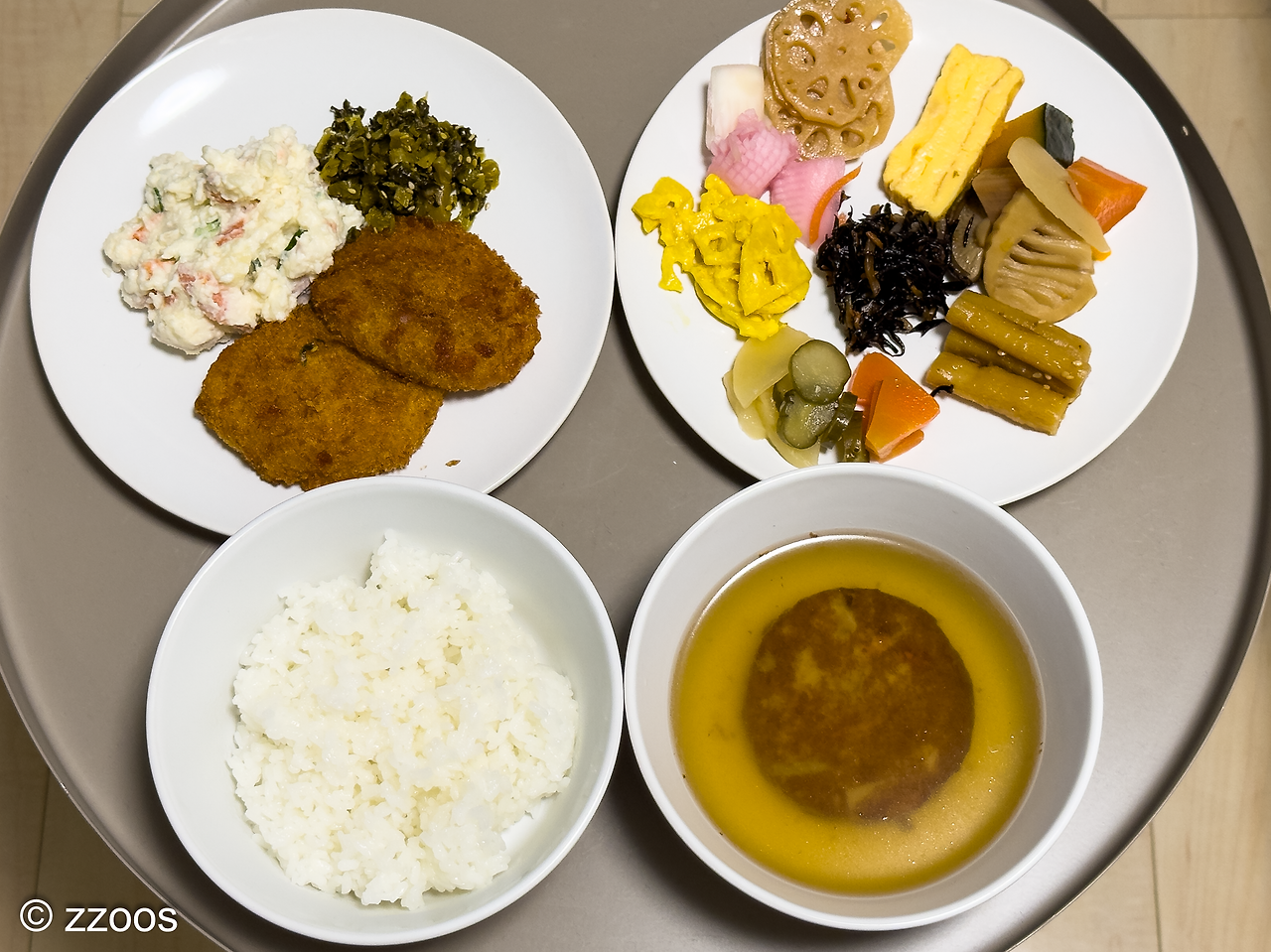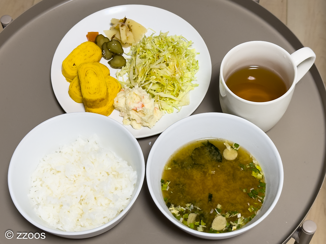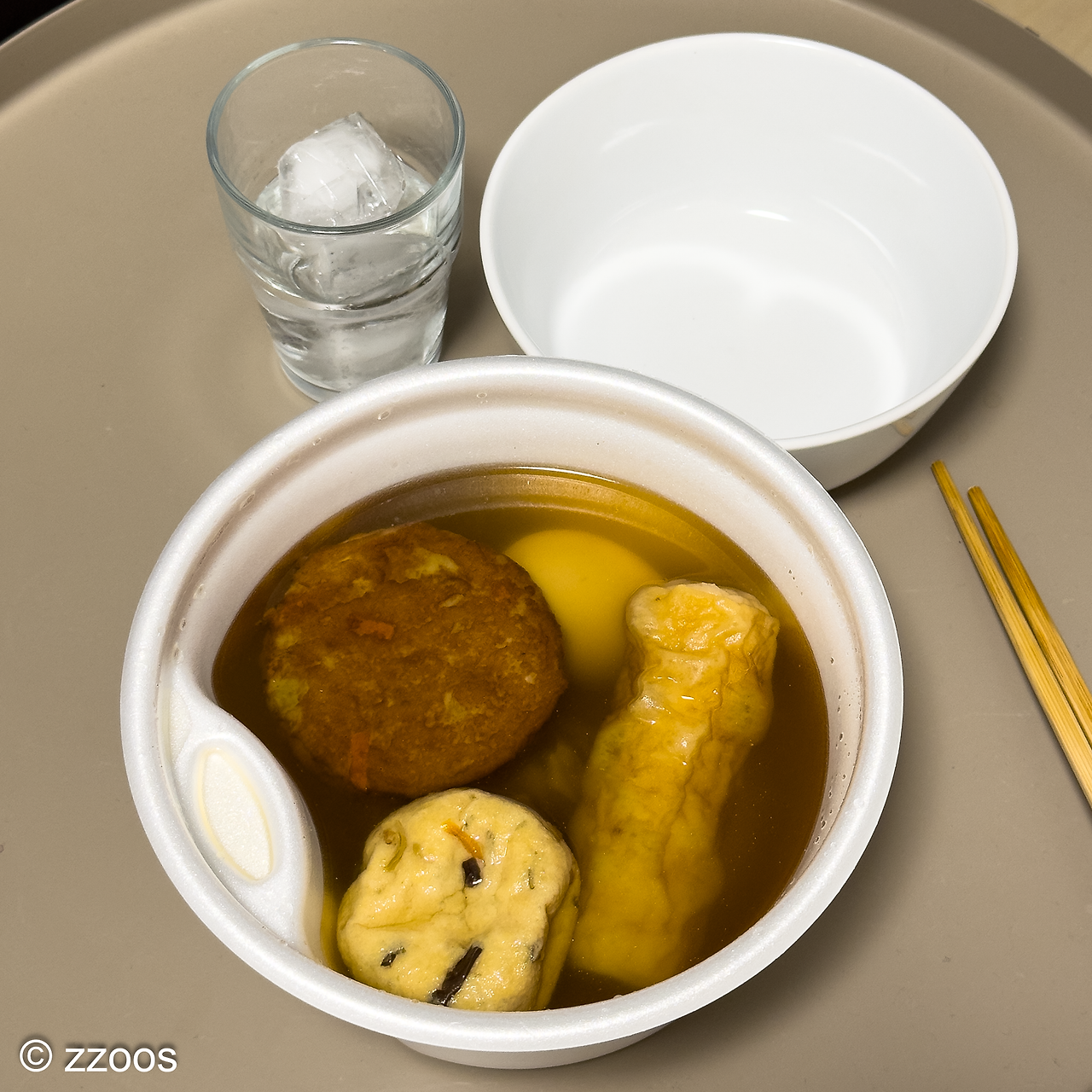 그렇게 술을 마신 다음 날은 느지막이 일어나서 남은 오뎅을 국 대용으로 해서 한 상을 차리기도 합니다. 아마도 마루쇼쿠(マルショク)까지 기어 나가서 야채 고로케랑 기본 반찬 세트를 사 온 것 같네요.