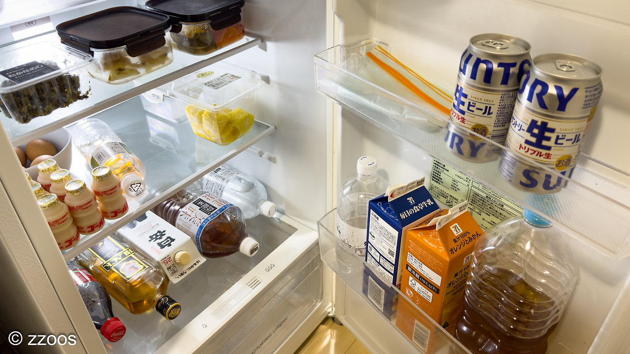 딱 여행의 절반 정도가 지났을 때 냉장고의 상태입니다. 쯔께모노와 달걀이 보이고, 장건강을 책임져주고 있는 요구르트도 있네요. 쇼츄와 위스키가 맨 아래에 누워 있고요. 그 옆의 우롱차는 쇼츄에 타 먹는 용도입니다. 마시는 물은 우유와 쥬스 옆에 있는 보리차예요. 그래도 유산균도 챙기고, 과일도 챙겨 먹고 있네요.