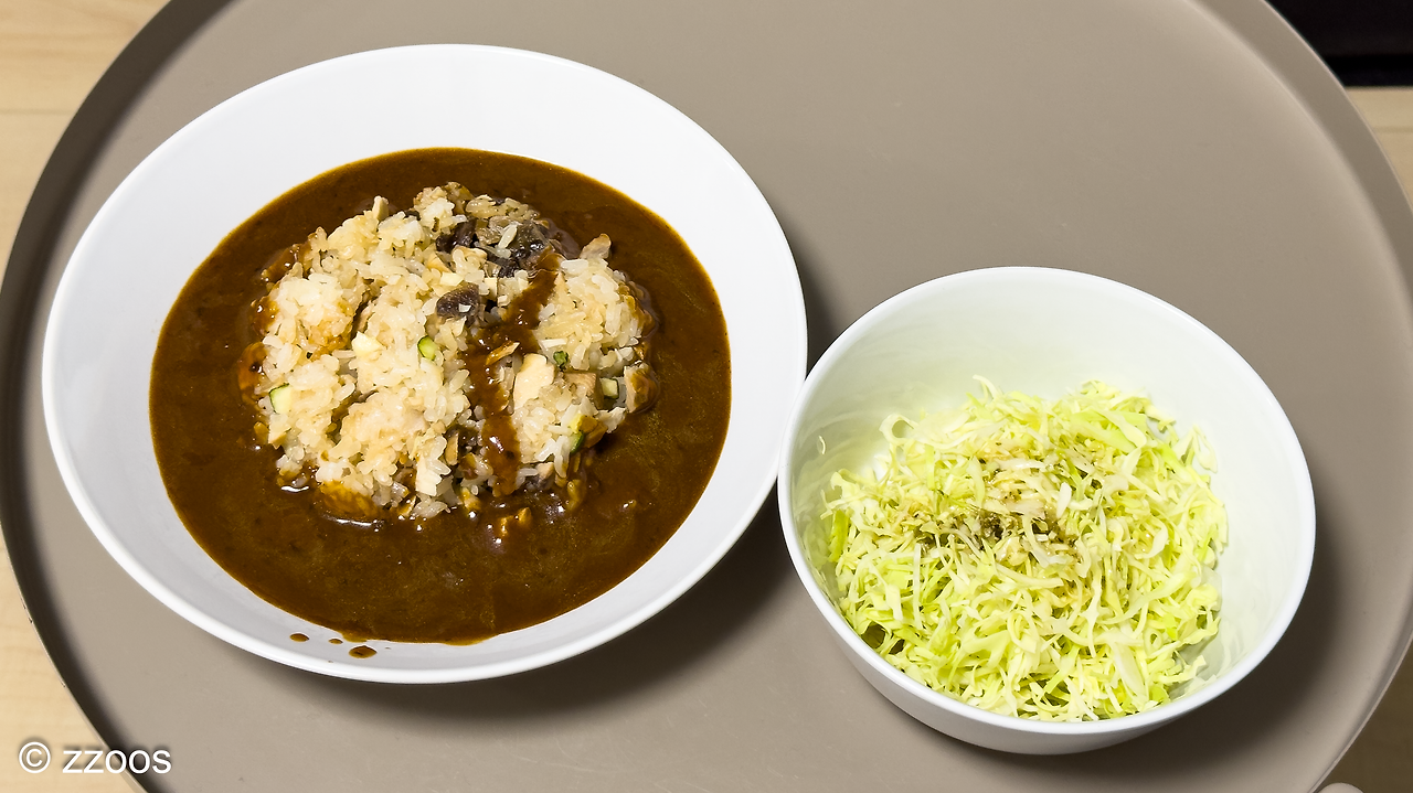 전날 슌아지 코사카(旬味こさか)에서 다 못 먹은 밥을 오니기리로 만들어 주셨거든요. 그걸 그릇에 담고 전자렌지로 데워서 카레와 함께 먹어치웠습니다.